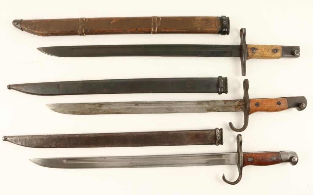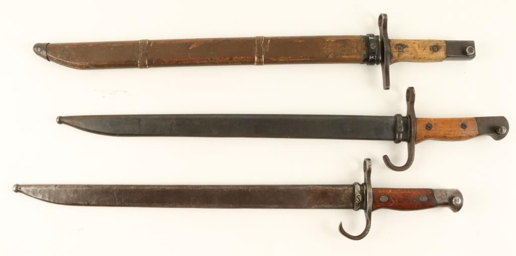 Lot of 3 Japanese bayonets, 2 with metal sheaths, one with a wooden sheath; all generally good condition overall. Est.: $125-$250.