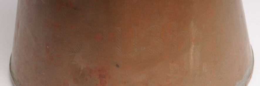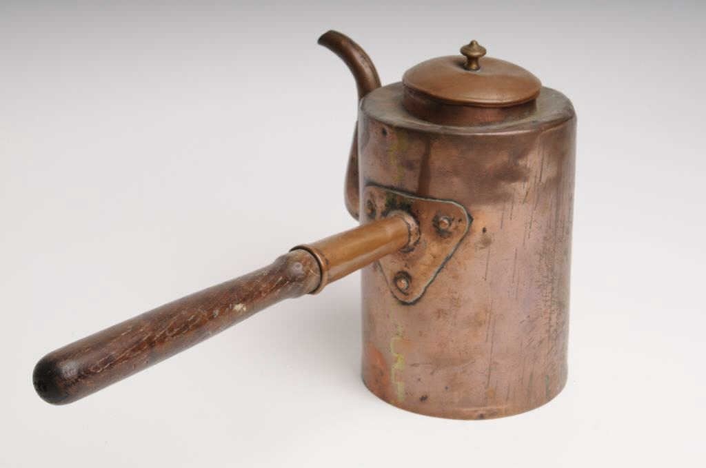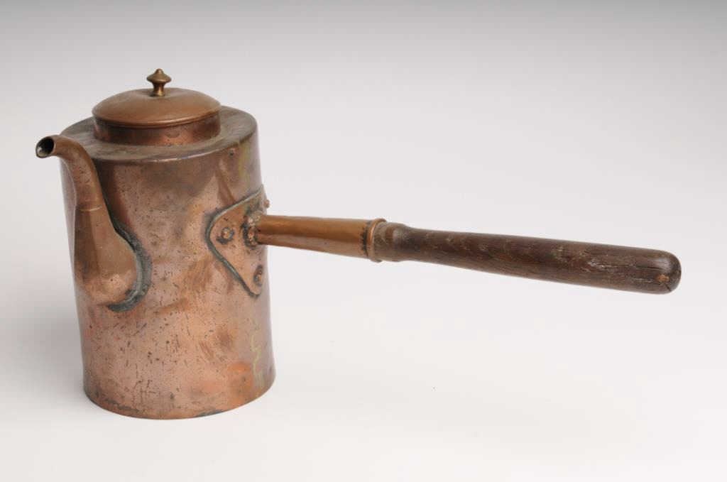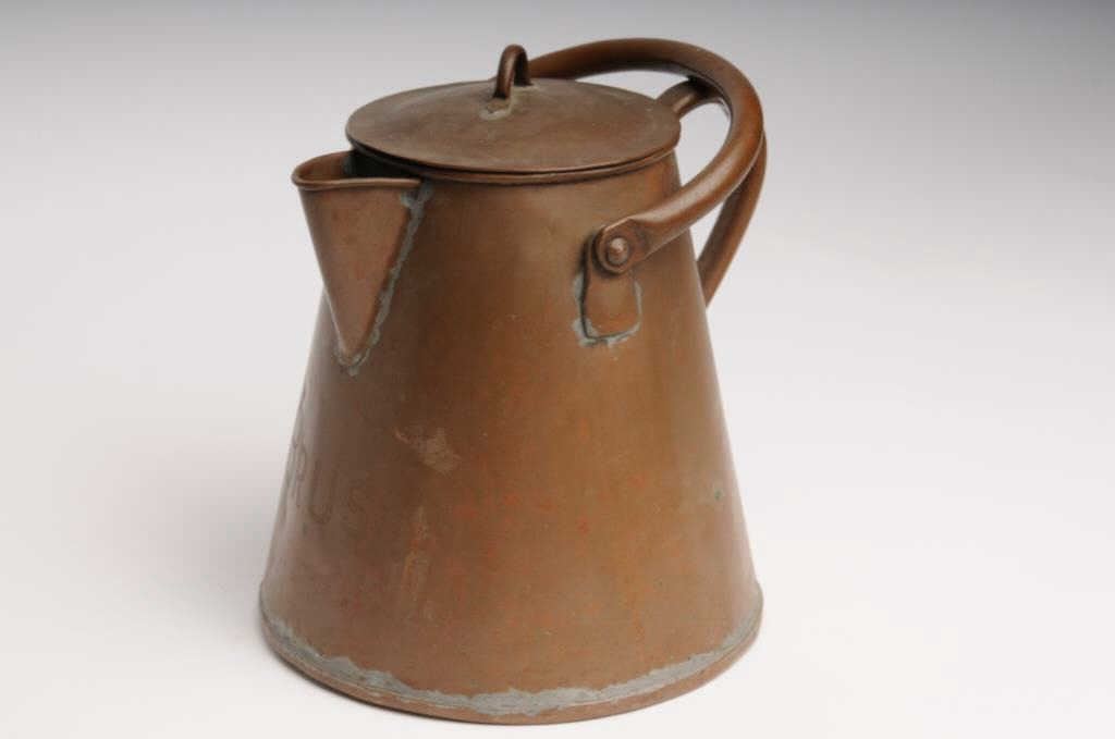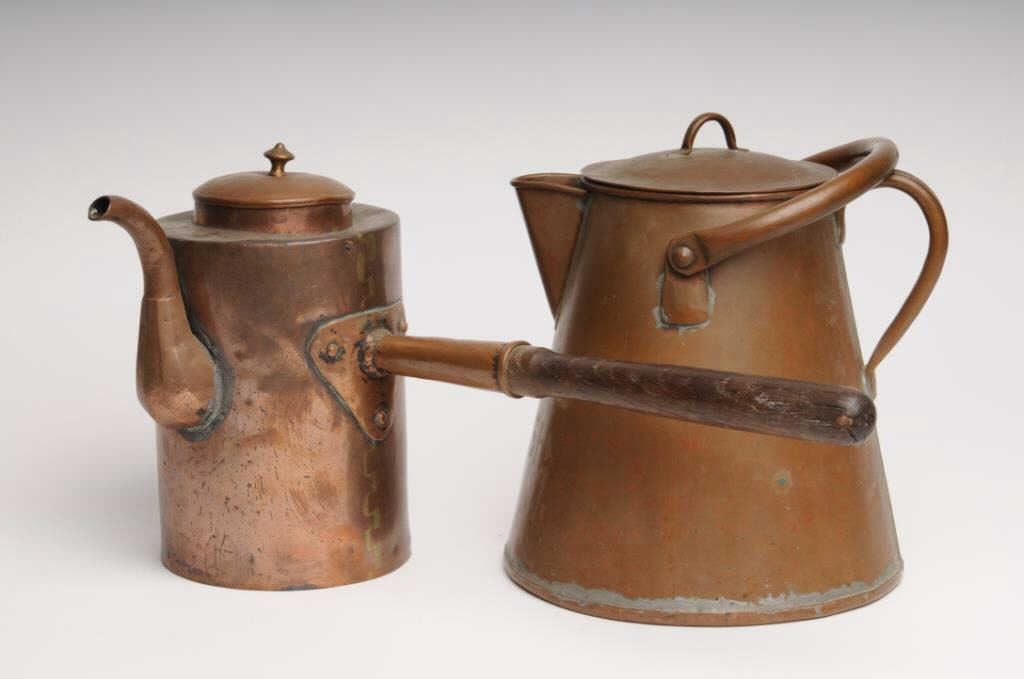Lot of two old pieces of copper campfire cookware including a coffee pot and lid, approximately 10” tall and another smaller coffee pot with attached extension handle, approximately 9” tall; both in used condition with dark patinas; just like thekinds “Cookie” would have for the boys out on the trail. Est.: $100-$200.