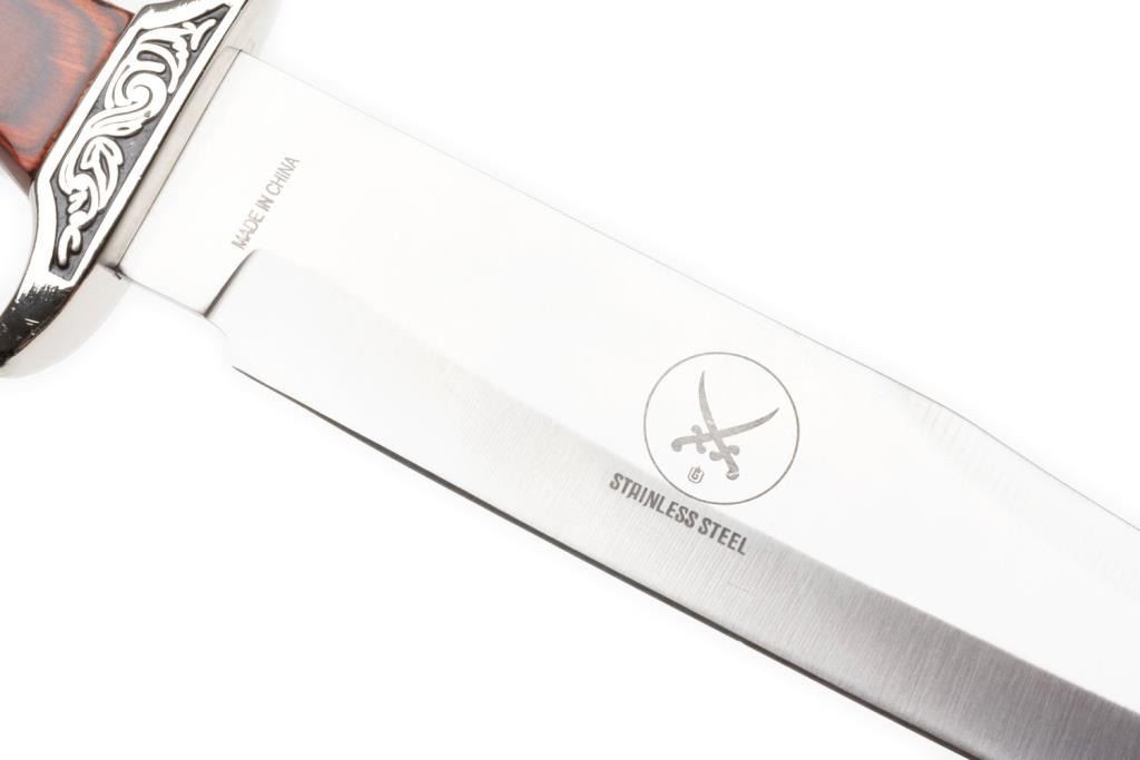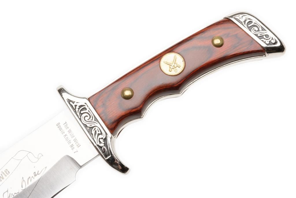 The Wild West Series #7 Jim Bowie knife with plain cardboard box, approximately 13” overall with an 8.5” blade, wood grip and decorated simple cross guard and pommel; like new condition. Est.: $125-$175.