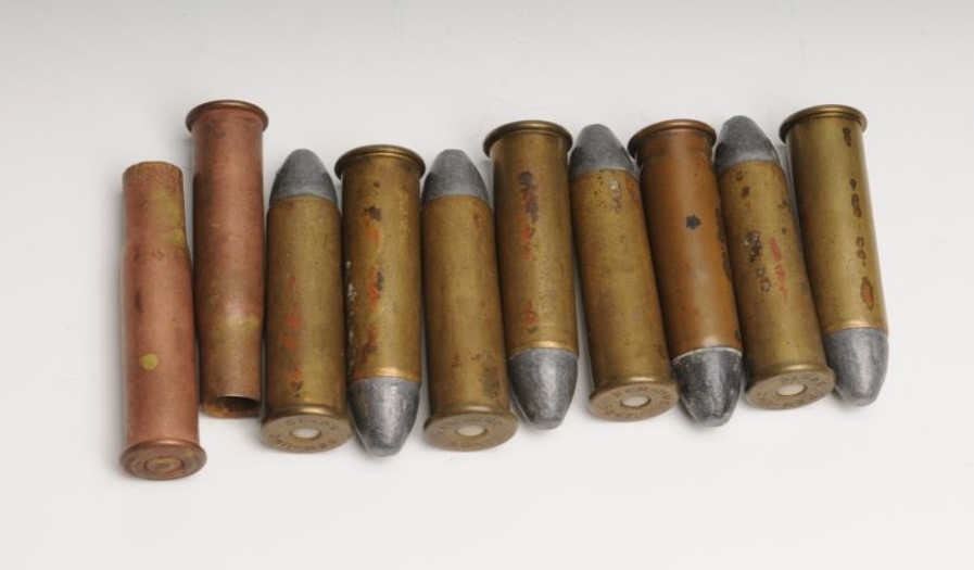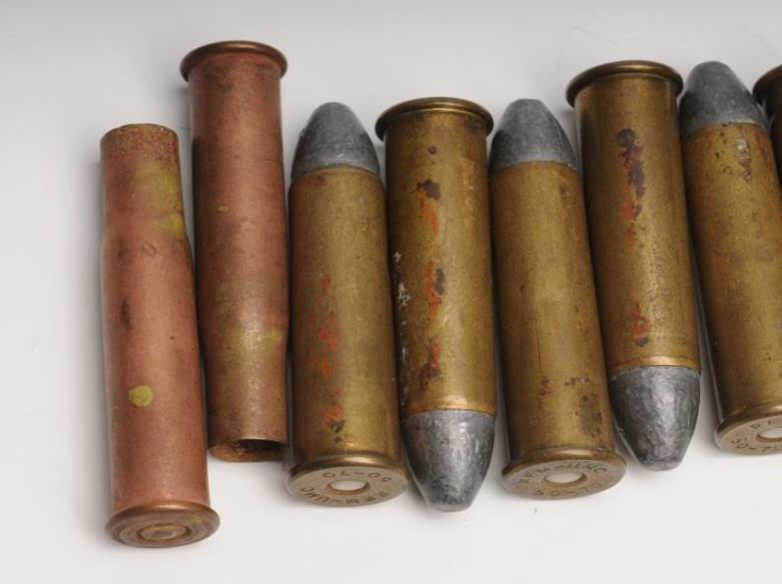 A collector’s lot of 50-70 caliber cartridges from different eras with various head stamps including Remington UMC. Eight loaded rounds and two fired cases, all in 50-70. Est.: $100-$300.
