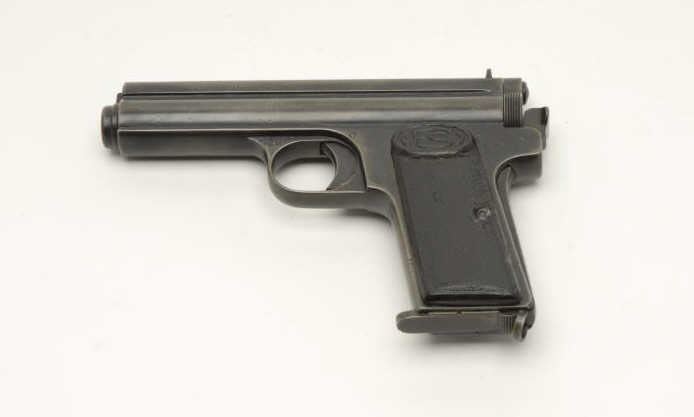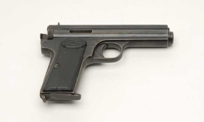 Frommer Stop semi-automatic pistol, .380 cal., serial #101338. The pistol is in good overall condition with a 3 3/4” barrel. The Frommer, referred to as a long-recoil pistol, was manufactured in Hungary and was originallyintended for use in the Royal Hungarian Army. Frommer manufactured the pistol from 1912 to 1945 in various forms. The pistol retains a significant amount of its military style finish. The checkered plastic grips are in good conditionshowing wear with small chips in several places. The pistol incorporates a grip safety which appears to function. The bore is good, the action functions and the markings are sharp. Est.: $150-$300. (C+R).