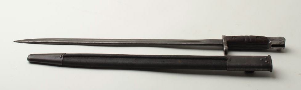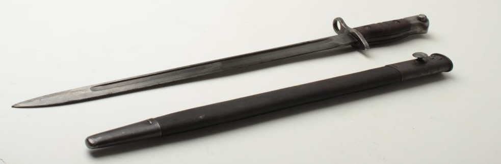U.S. Remington bayonet for British Pattern 14 rifle, the bayonet features a 16 13/16” blade and overall length of 22 ¾”. The bayonet is in good overall condition showing use but retaining the majority of its military finish. The bladefeatures numerous British proofs including a short arrow over the crown. The ricasso is stamped with “1913” over “10 16”with the Remington circle logo. The stitched leather scabbard has a throat with a frog button. The reverse of the throat isstamped, “WUH”. Est.: $75-$150.
