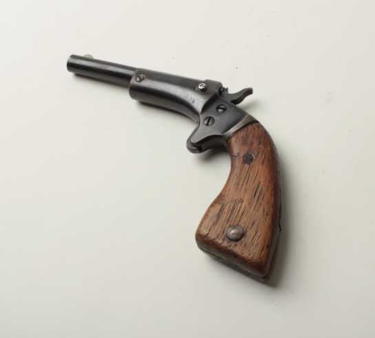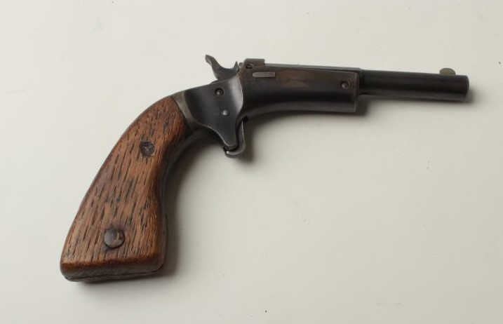 Lot 668 Stevens single shot tip up pistol, .22 caliber, 3 ½” barrel, blue finish, oversized wood grips, S/N