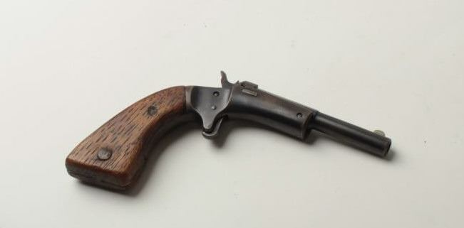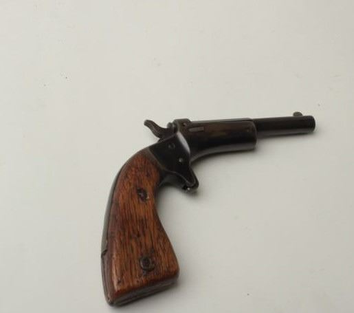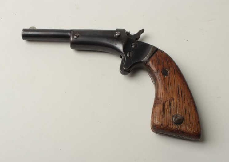 Stevens single shot tip up pistol, .22 caliber, 3 ½” barrel, blue finish, oversized wood grips, S/N 55745. This pistol remains in overall very good condition showing its blue finish starting to go to a brown patina. The grips are oversizedhandmade replacements and remain in good condition. The bore is fair with some pitting and the action is crisp. (Antique) Est.: $100-$200