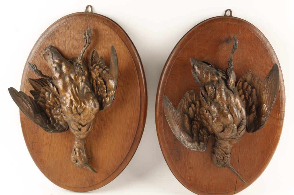 Pair of cast bronze game birds by L. Moigniez mounted on wood plaques, each approx. 14” x 10” overall and nicely accomplished. Est.: $150-$300.