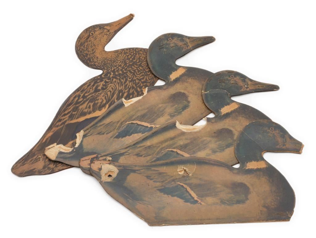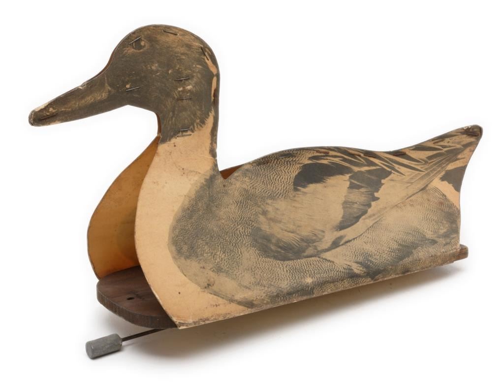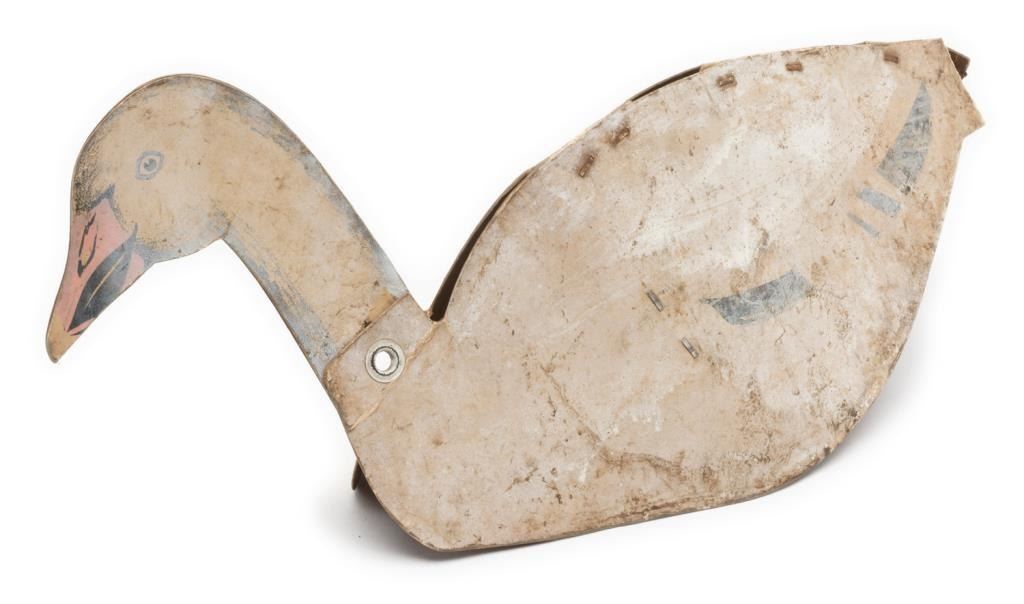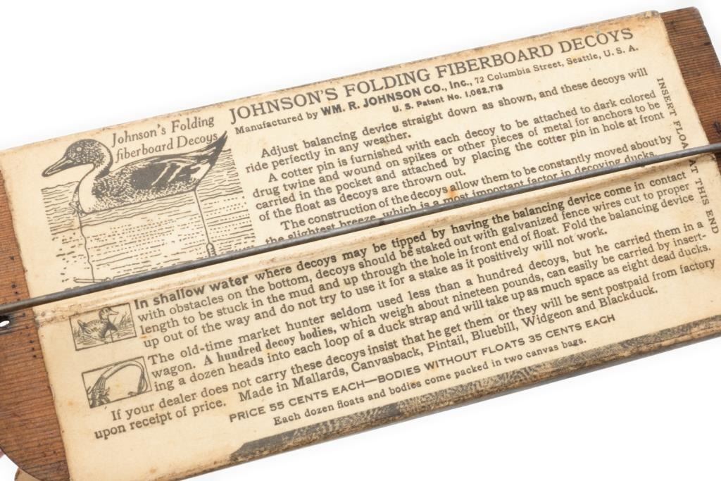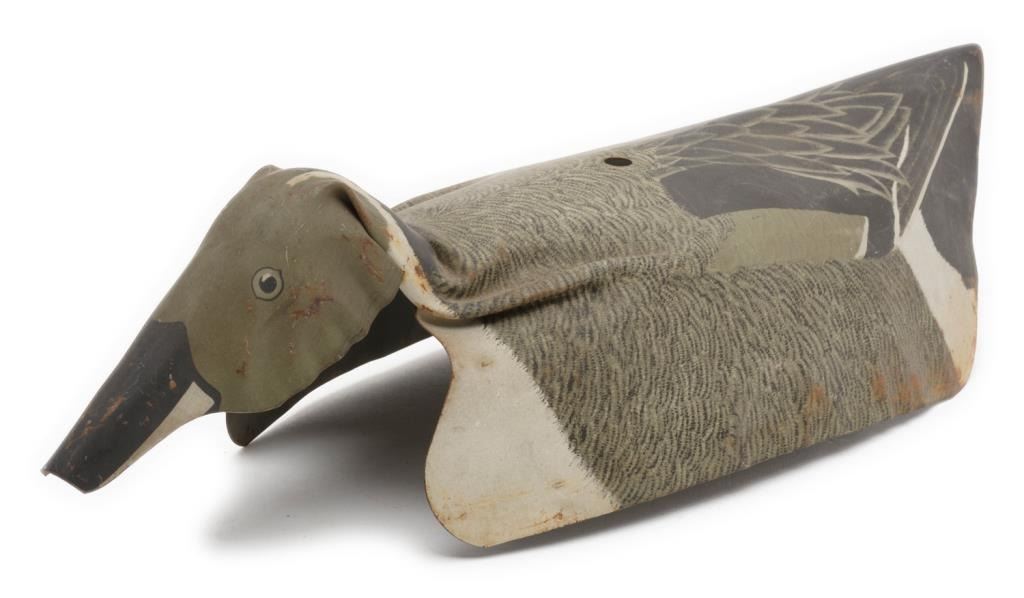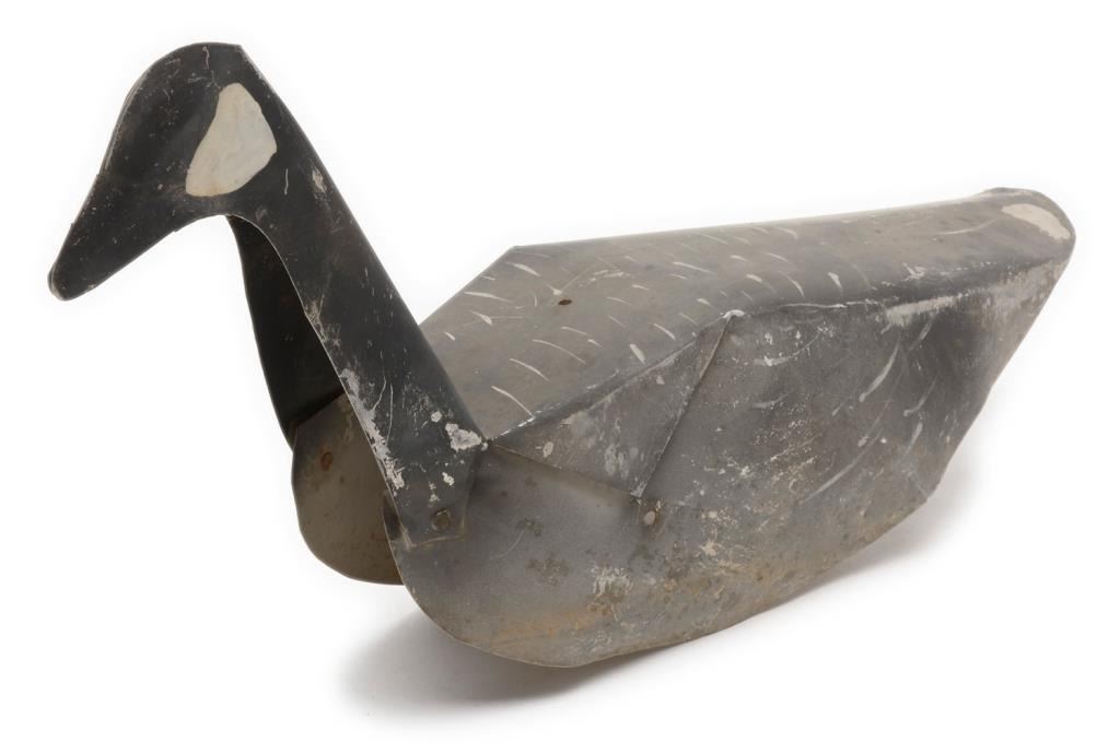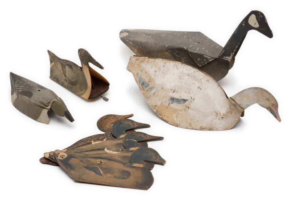 Lot of 2 metal and 6 fiberboard old water fowl decoys including a large metal goose decoy with the majority of what appears to be its original paint, approx. 26” x 7” x 14” in good overall condition; next is a metal duck decoy in overallgood condition, approx. 15” x 6” x 4” and retaining the majority of its stenciled coloring (marked “Chris’ Decoy 2520 Brdwy, Sacto, Cal. Pat. No. 271608; also an interesting large painted fiberboard duck decoy, approx. 25” x 9” x 11”with a collapsible head and neck for easier transportation and storage (worn but still good overall); also a lot of 5 painted fiberboard decoys by the William R. Johnson Co., Seattle, WA; one is set up with float wood and weight; approx. 16” x 5” x 9” and in overall good condition; the other 4 are unfolded; approx. 16” x 9” and showing damage from storage; some minor, some major & in need of careful conservation. Consignor note suggests these Johnson Co. “floats” are ca 1925. Est.: $150-$300.