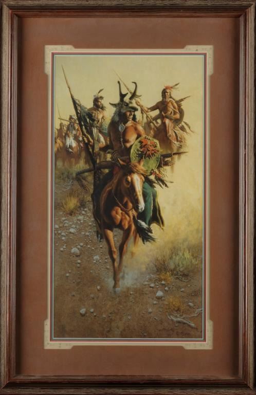 Lot 692a Large finely quadruple matted color print of Indian warriors in full regalia by noted Western arti