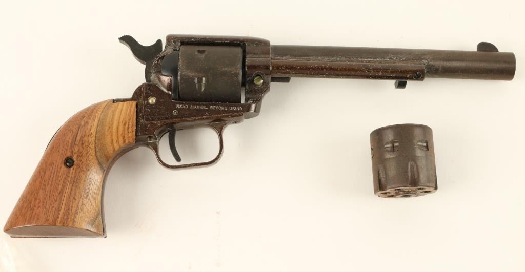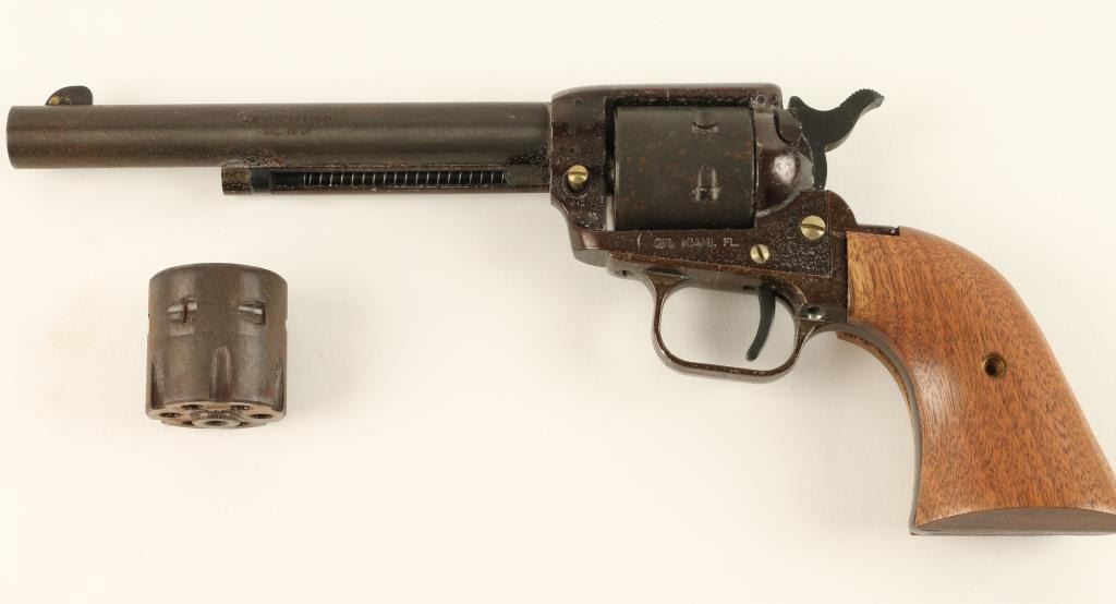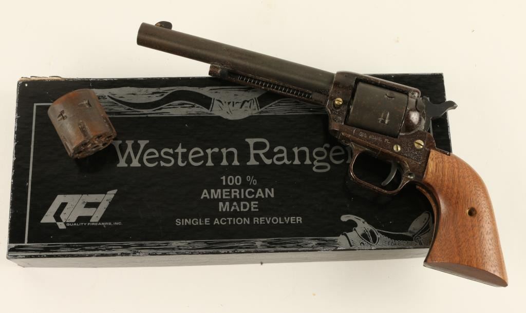 Western Ranger SA revolver, .22 L.R. caliber, 6 ½” barrel, wood grips, blue finish, S/N RR12984. This revolver remains in overall fair condition with areas of rust. The action is fair and the bore is fair. Also included is its original boxand an extra cylinder. (Modern/PPT). Est.: $75-$150