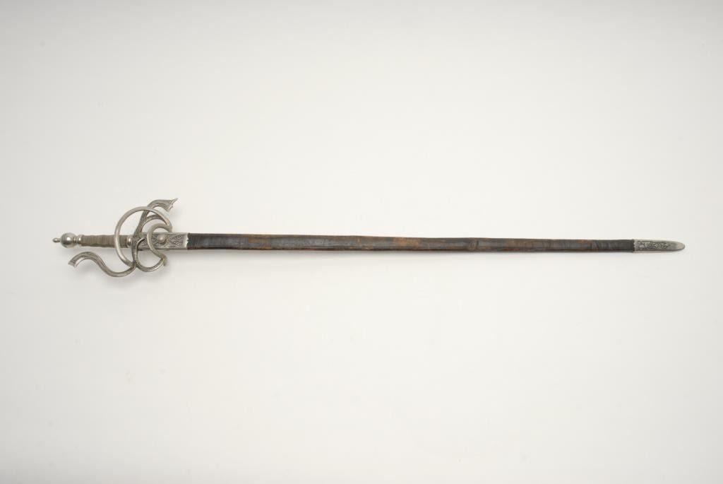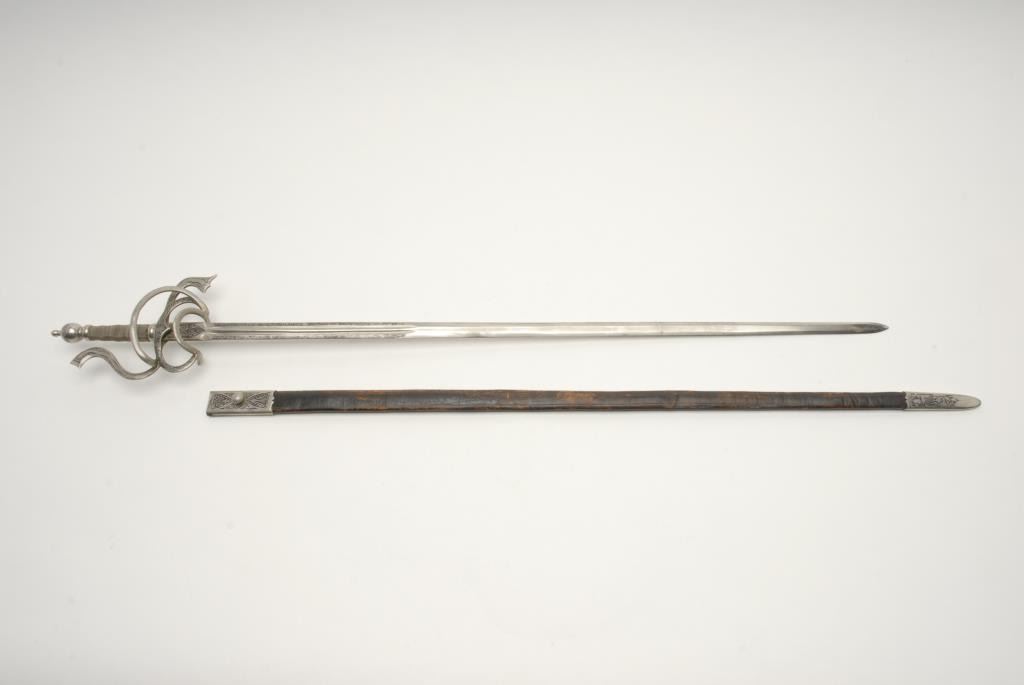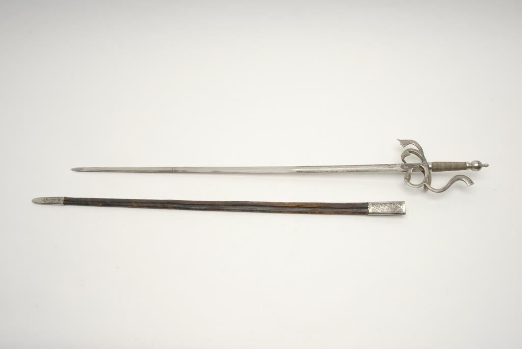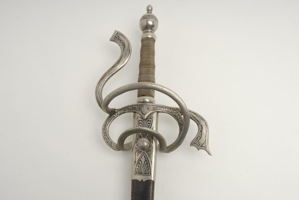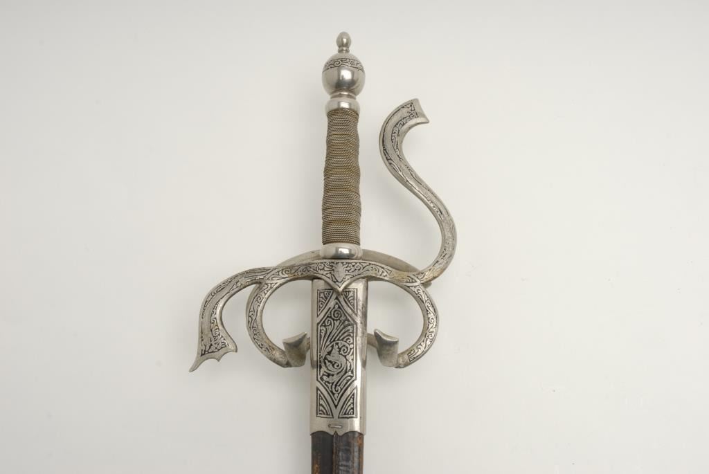 Victorian to early 20th century rapier with fancy plating and etched decorations. Quality work probably Toledo or Italy. Well-made and tempered blade. Matching leather scabbard. In good condition with normal and real age of about 100plus years. Measures 45” overall with a 38” blade. A quality sword that is armour period but antique. Est.: $400-$800