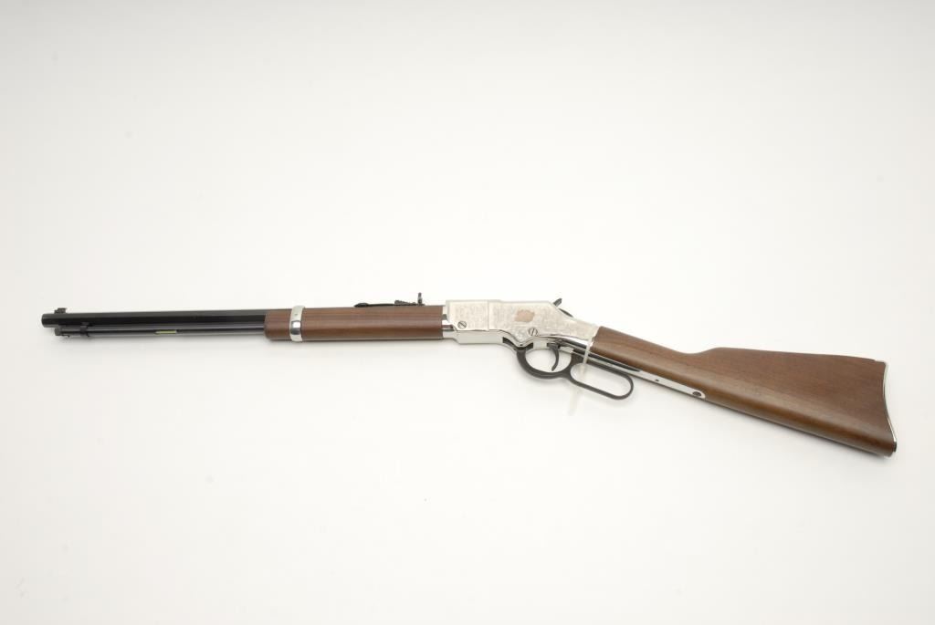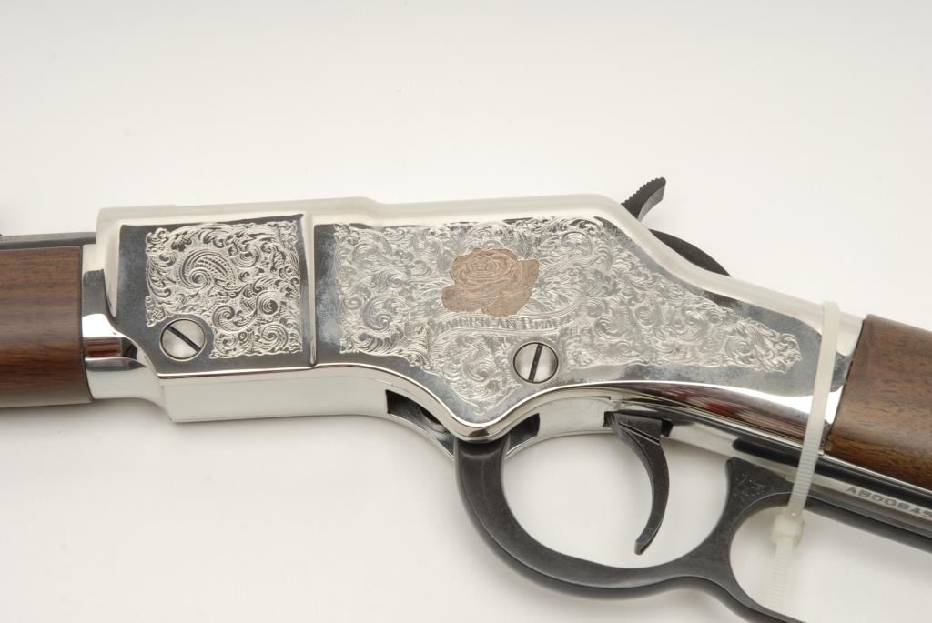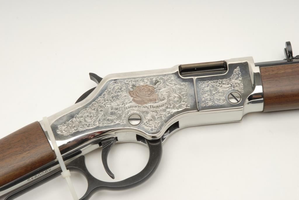 Henry American Beauty model lever action rifle, .22 Long Rifle cal., serial #AB00845. The rifle is as new in the box with a 20” octagon barrel. The special edition American Beauty features a polished nickel, coin finished receiver withbeautiful engraving of an American Beauty rose on each side of the receiver. The smooth wood stocks are in as new condition as well with a smooth polished nickel butt plate. The rifle comes in the original box with all associated packingmaterial. Est.: $500-$800. (Modern).