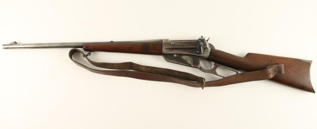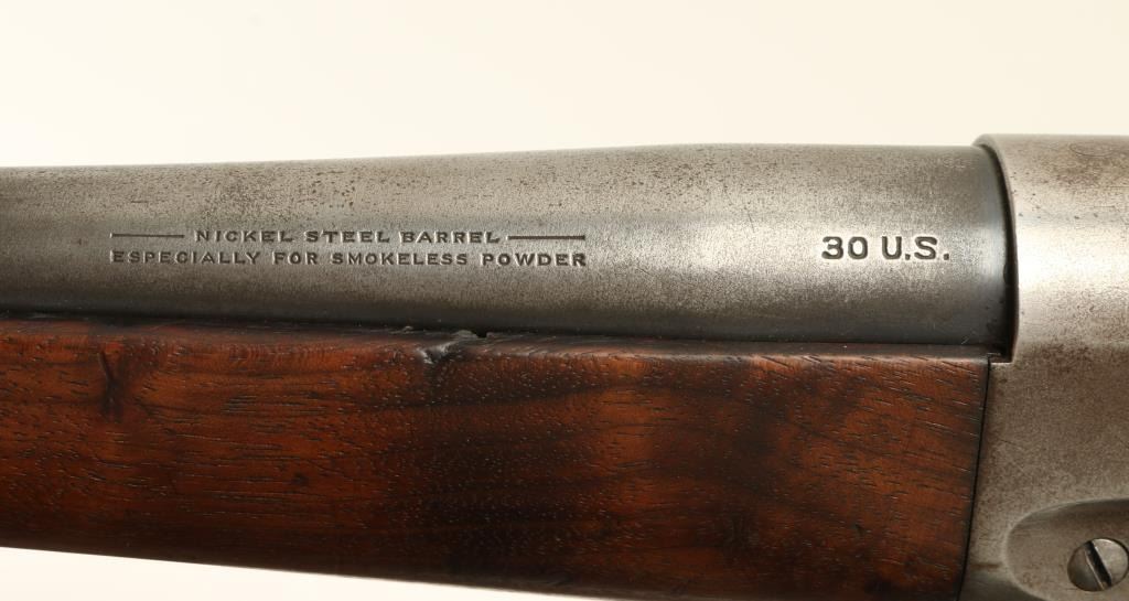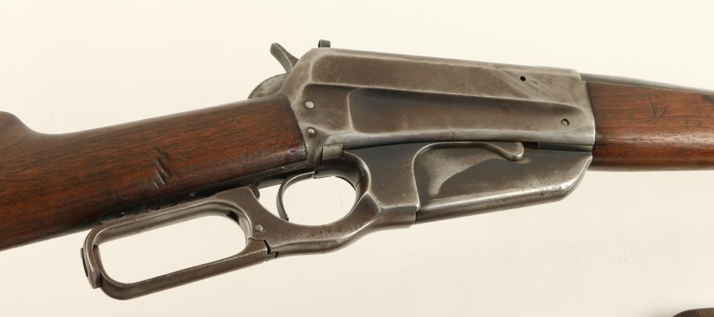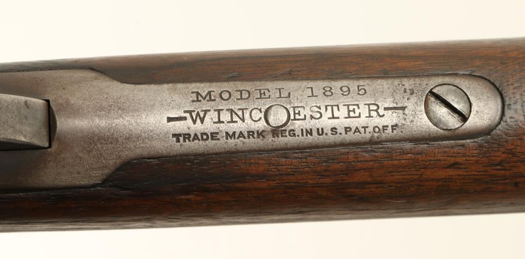 Winchester Model 1895 lever action rifle, .30 U.S. caliber, 22” round barrel, S/N 72213, Lyman receiver mounted rear sight and rotational blade front sight, blued finish, wood stocks in overall good condition displaying traces of original bluein protected areas, good bore, crisp action, good markings and good wood with added non-factory sling eyelets and leather sling. (C&R). Est.: $500-$900.