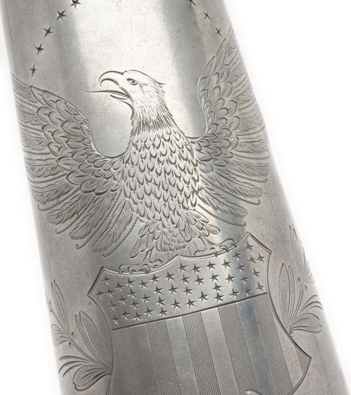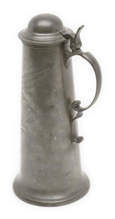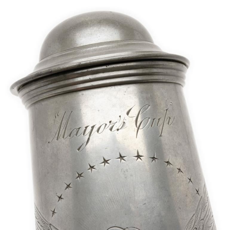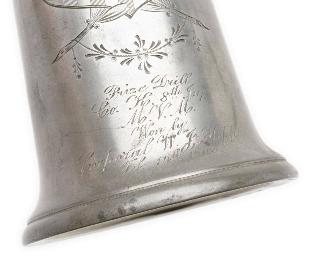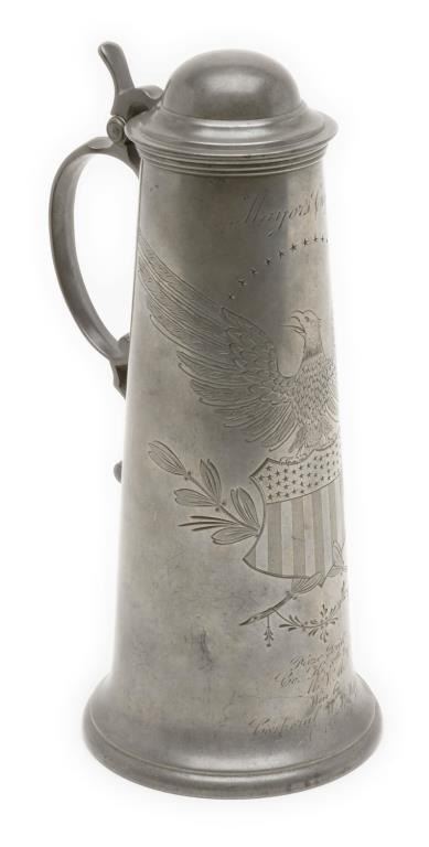 Large pewter engraved and inscribed presentation tankard, approximately 12.5” in height by famed maker Reed & Barton and marked on the base including number “024 0 S”. The piece is in overall very good to fine condition and has abeautiful dark patina with a large spread eagle over the Union Shield engraved on the front and displays the inscription “Mayor’s Cup/Prize Drill/Co. K/8th Inf./M.V.M/Won by/Corporal W.J. Hoppe/Feb. 14, 1907”. Would be interesting tofurther research Corporal Hoppe’s military records. Est.: $200-$400.