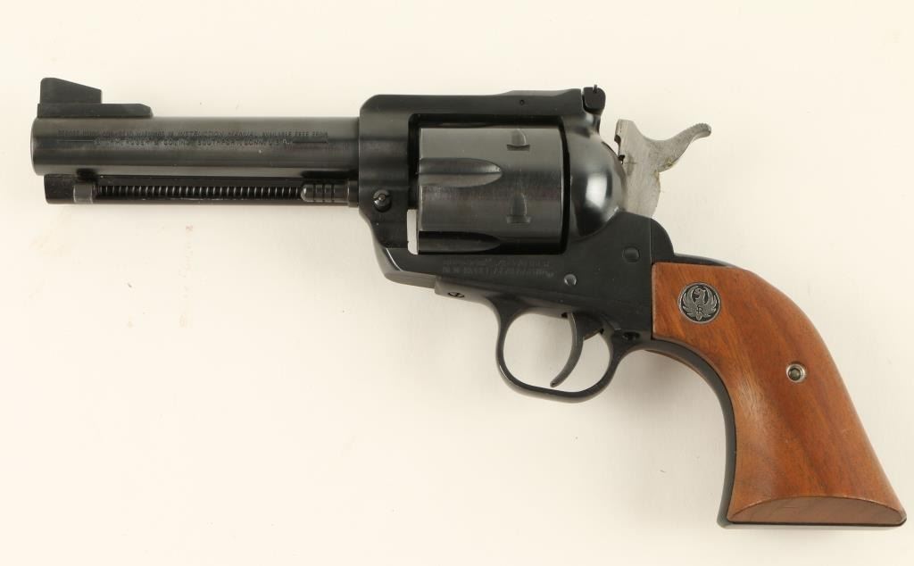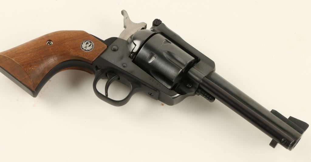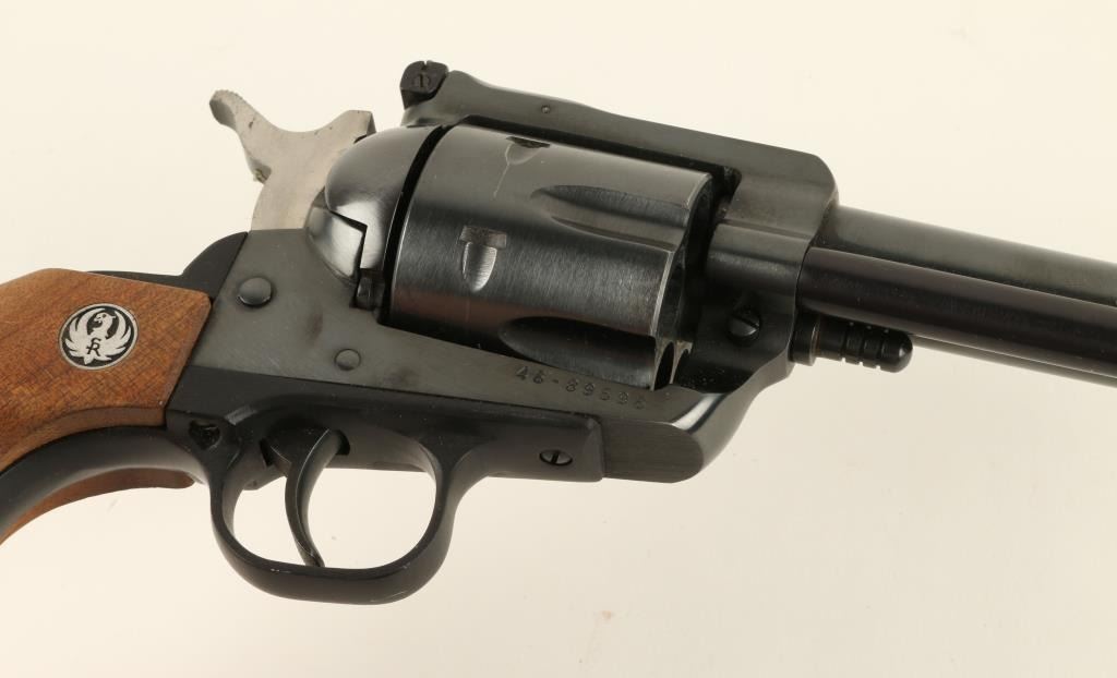 Ruger New Model Blackhawk SA revolver, .45 cal., 4 ¾” barrel, wood grips, blue finish, S/N 46-89596. This revolver remains in overall excellent condition showing majority of its original finish along with some slight wear to the muzzle and adrag line on the cylinder. The grips remain in very good condition with some dings and scratches. The action does not work at time of description and the bore is very good. (Modern/PPT). Est.: $200-$400