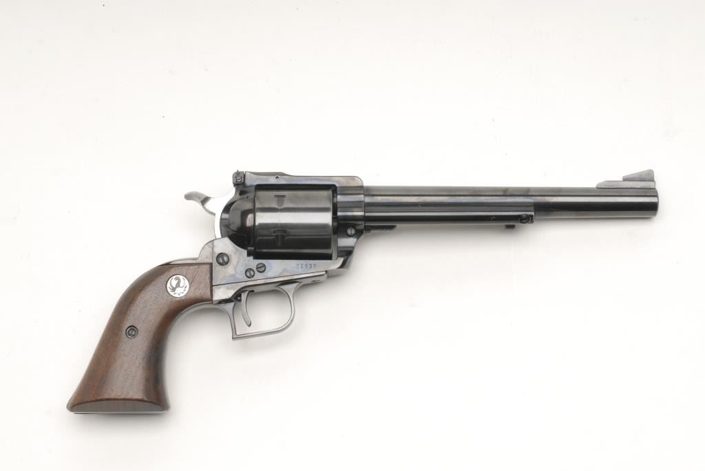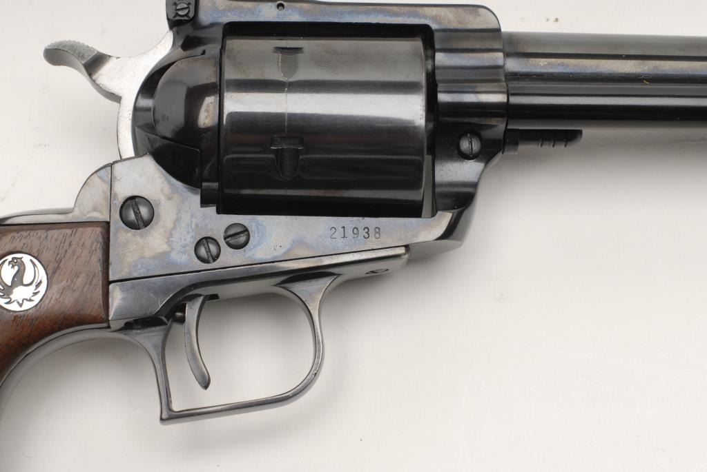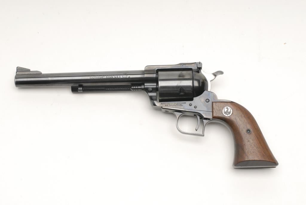 Ruger Super Blackhawk single action revolver, .44 Magnum caliber, 7.5” round barrel, no transfer bar older model, S/N 21938, blued finish, smooth wood medallion grips in overall excellent condition displaying approximately 99% original finish, fine bore, action, markings and grips. (Modern/PPT). Est.: $500-$1,000.