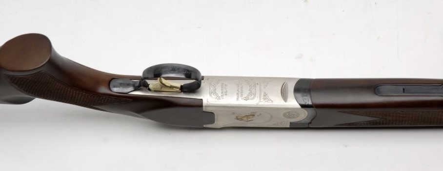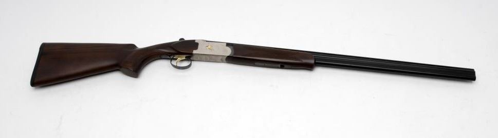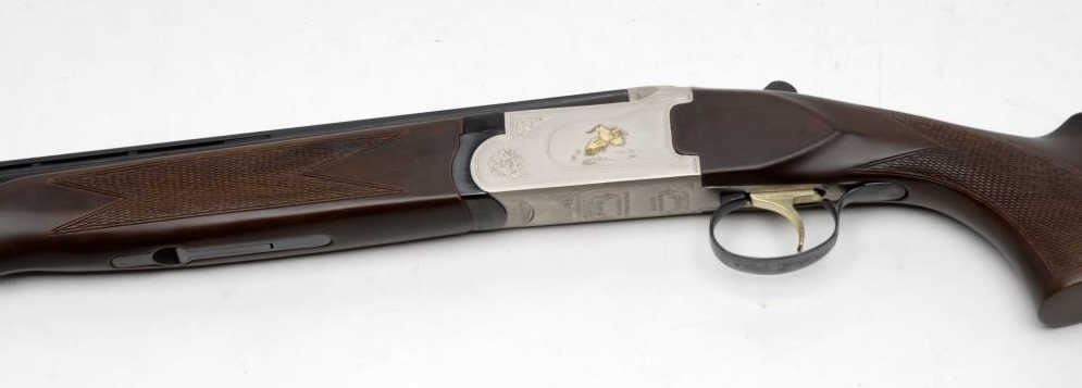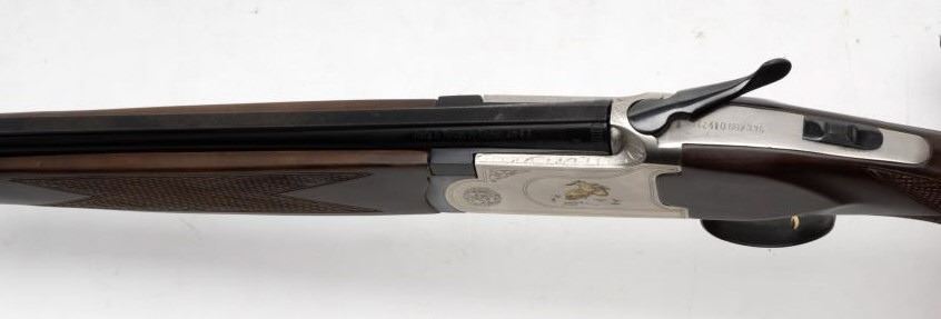 Mossberg Silver Reserve Model O/U shotgun, .410 gauge, 26” ventilated rib barrels, S/N TR410002336, single gold trigger, blued barrel assembly, game scene ornamented receiver, checkered wood stocks in overall very good to near fine condition showing the majority of original finish, crisp actions, bores are dirty and may clean to very good; fine wood stocks, hard rubber butt pad. (Modern/PPT). Est.: $500-$1,000.