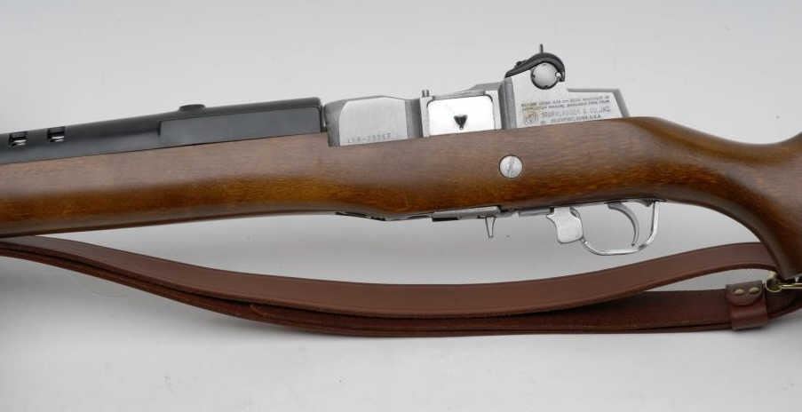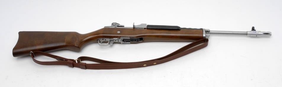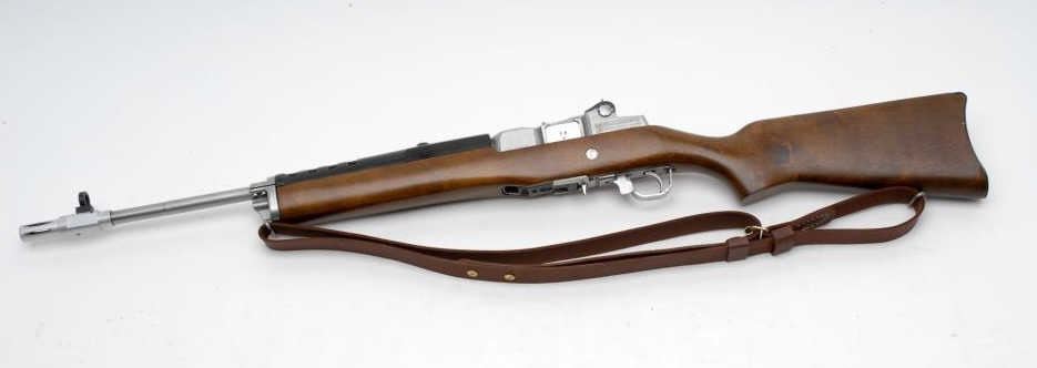 Ruger Mini-14 “Ranch” semi-automatic rifle, .223 caliber, 20” barrel, S/N 184-23357 in overall fine condition, stainless steel, fine bore, crisp action, Eagle muzzle break, wood stock; accompanied with a leather sling. (Modern/PPT). Est.: $500-$800.
