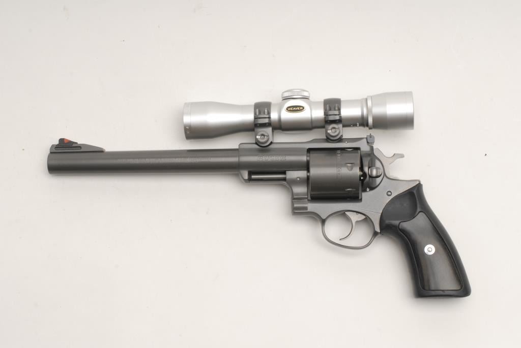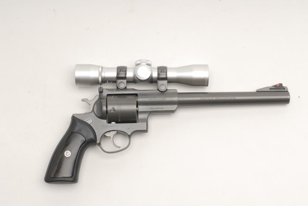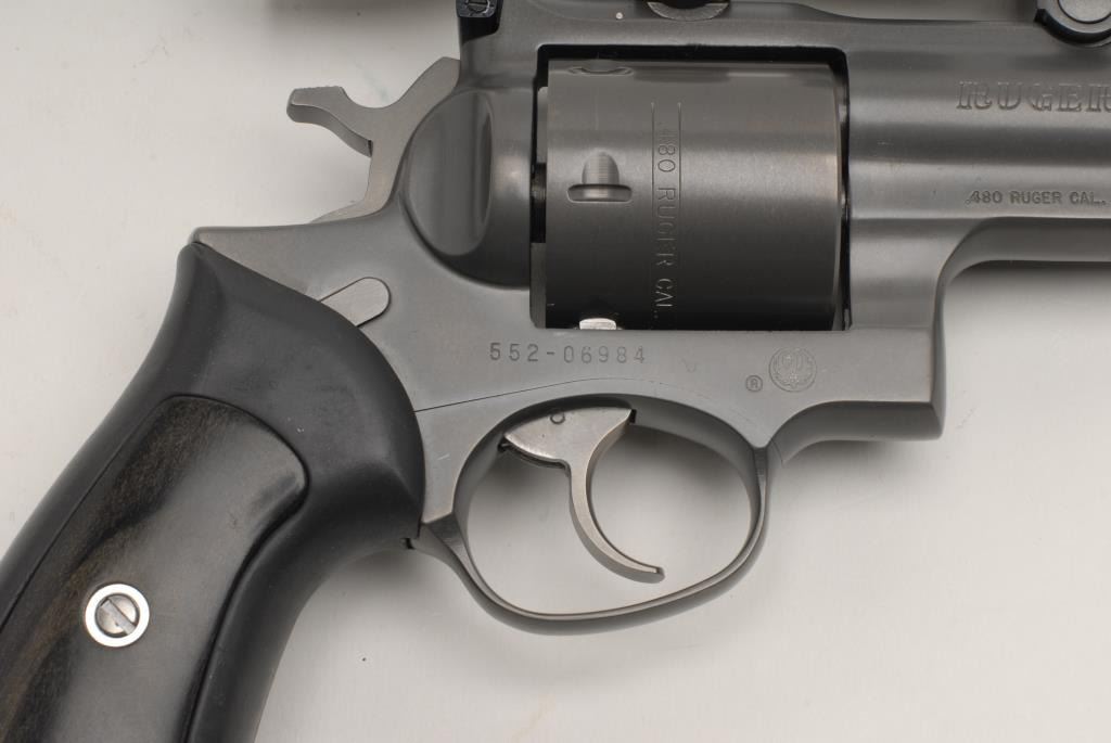 Ruger Super Redhawk DA revolver, .480 Ruger caliber, 9.5” barrel, hard rubber grips with wood inserts, S/N 552-06984, grey finish, mounted with a Weaver H-4 4X28mm scope with sharp optics. This gun is in overall excellent condition showinglittle if any use; fine bore, crisp action, sharp markings and fine grips. (Modern/PPT). Est.: $500-$1,000.