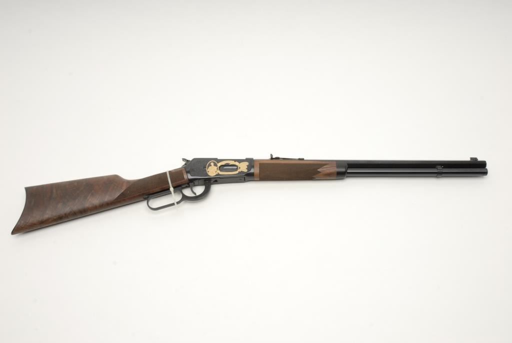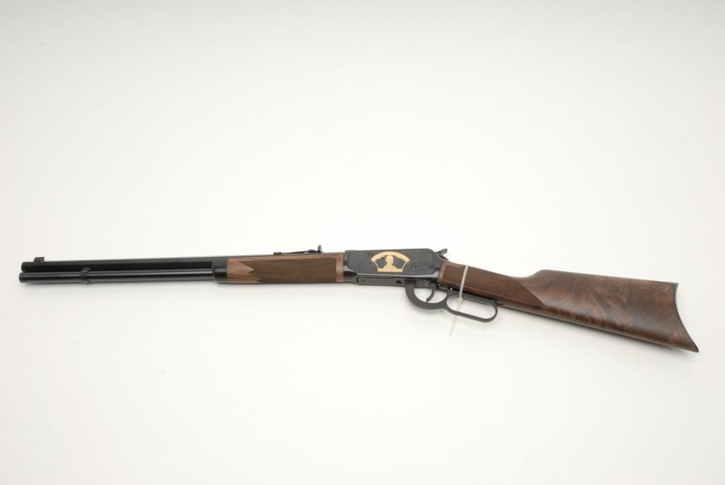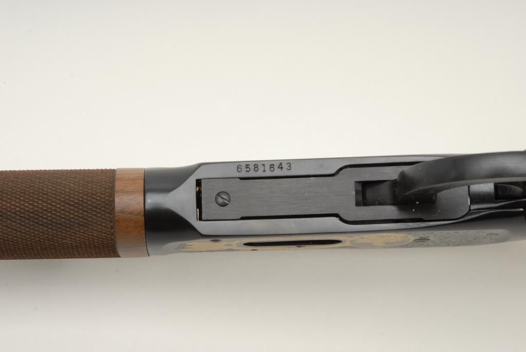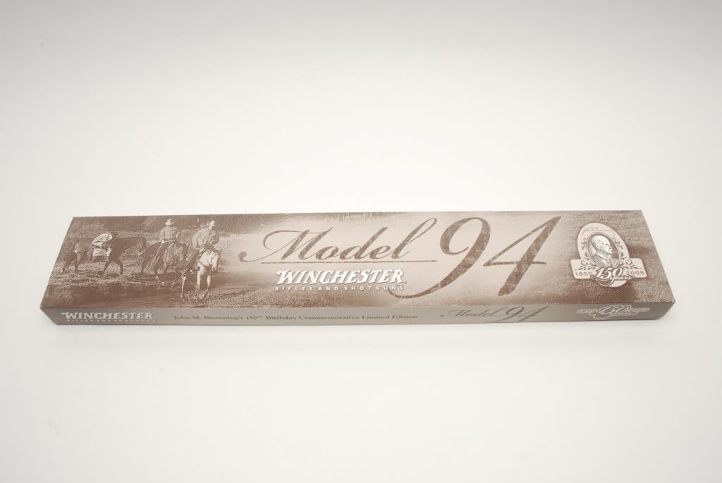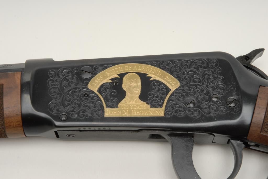 Winchester Model 94 TS John M. Browning 150th Anniversary Limited Edition lever action rifle, .44 Magnum cal., serial #6581643. The rifle is in as new in the box condition showing only handling and little to no use. The rifle has a 20” blued, octagon barrel and tang mounted safety. Limited to an edition of 150, this rifle features an engraved receiver with gold inlay depicting John M. Browning. The high grade checkered wood stocks show wonderful figure and are as new with a smooth, crescent metal butt plate. In the original factory box, sleeve and Winchester shipping box with all associated packing material. Manufactured in 2005, this rifle is one of a group that was the last rifles produced at the New Haven, CT plant that closed in 2006. Est.: $700-$1,400. (Modern).