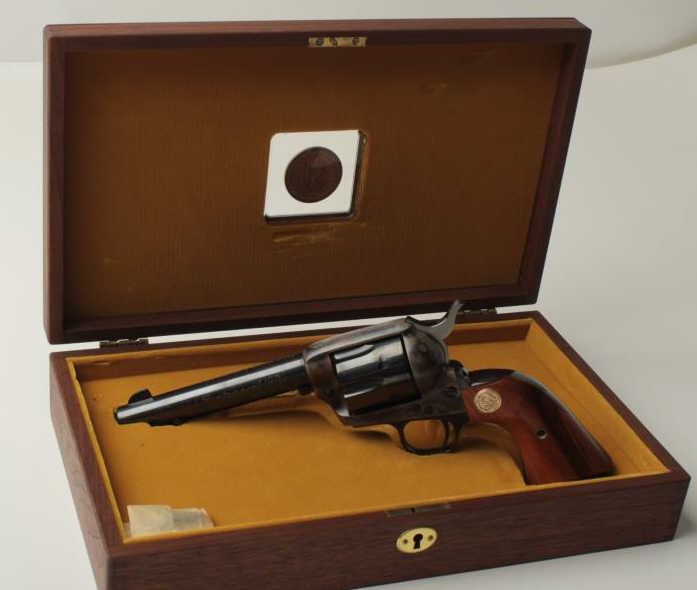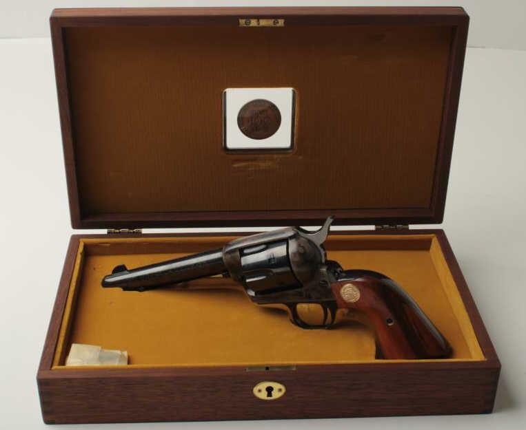 Colt SAA 1971N.R.A. Centennial in .357 Mag caliber with 5 ½” barrel, blue and case hardened finish with commemorative features in original case, S/N NRA6567 in like new condition with slip cover. See prior lot for consecutive serial number.(Exempt/No PPT) Est.: $1250-$2500