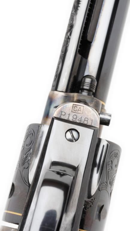 **Uberti/Cimarron modern “American Carbine” Model copy of a modified Colt SAA revolver with integral wood butt stock, .45 caliber, 18” barrel, S/N P19481, custom engraved and gold banded by Jim Downing, blued and case hardened finish, smoothwood butt stock. Accompanied by factory cardboard box and instructions manual. This gun is in like new condition as customized and shows little handling; consignor states gun has been custom polished, honed, tuned and fitted. One-of-a-kind! Est.: $1,500-$3,000.