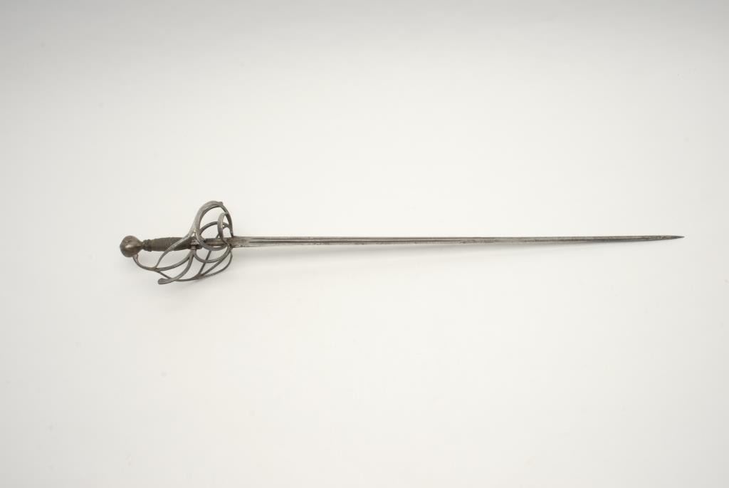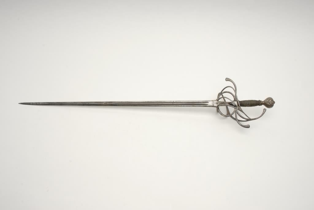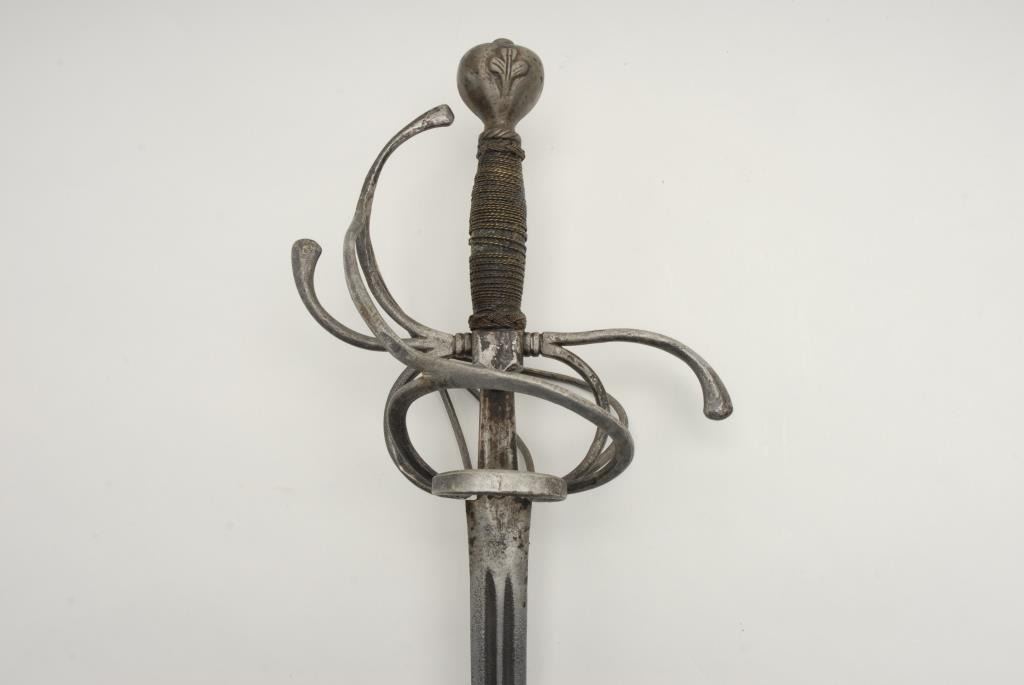 16th to 17th century rapier of Central European origin assembled with period elements. Measures 41 ½” overall with a 36” blade which was most likely 3”-4” longer originally. Proper style wire wrapped grip is slightly lose. A stylized leaf orFluer d’ Li on chiseled pommel. Some pitting and evidence of old cleaning. The blade maker’s marks are not legible. A good match of period element and a very decent and representative rapier. Est.: $1400-$2800