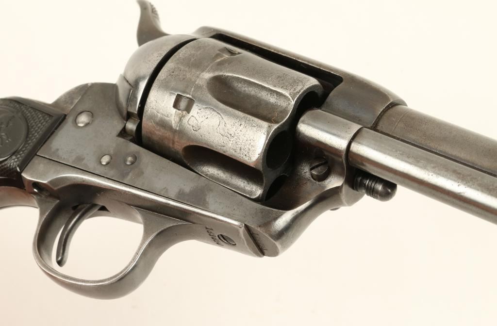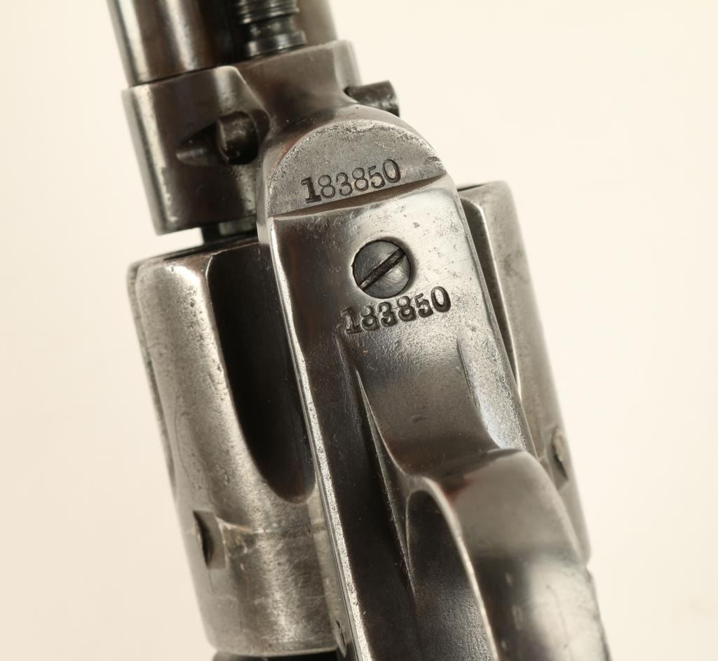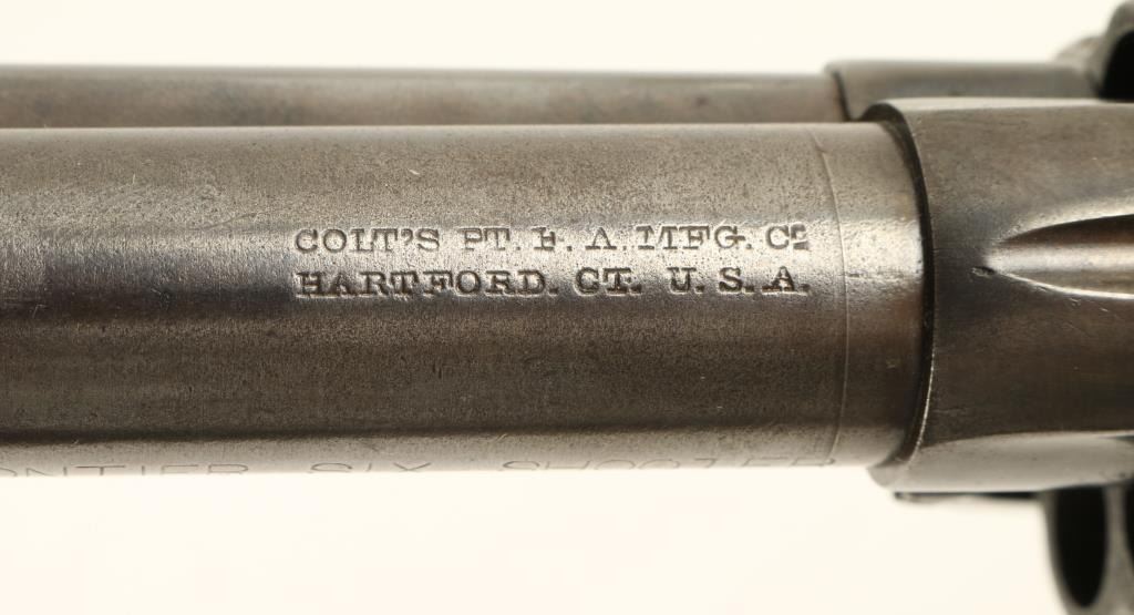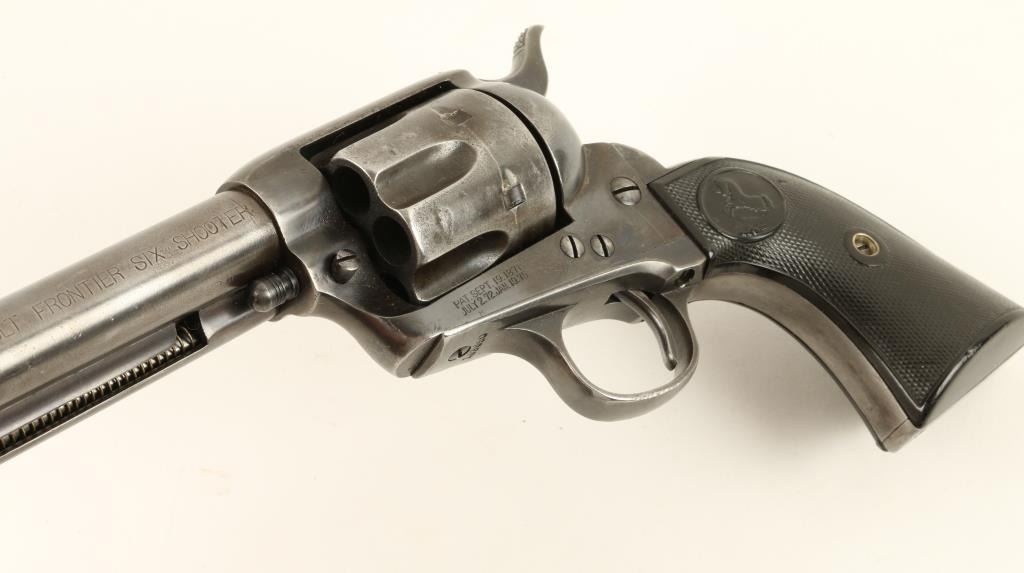 Colt SAA revolver, .44-40 caliber, 4.75” barrel, S/N 182850, blued finish, checkered hard rubber grips, “COLT FRONTIER SIX SHOOTER” marking on barrel; in overall very good + condition displaying a mixture of blue finish with darkpatina and some scattered light pitting around firing areas; crisp action, very good markings and overall good grips with some old mars on the lower area of the right grip. (C&R). Est.: $2,000-$4,000.