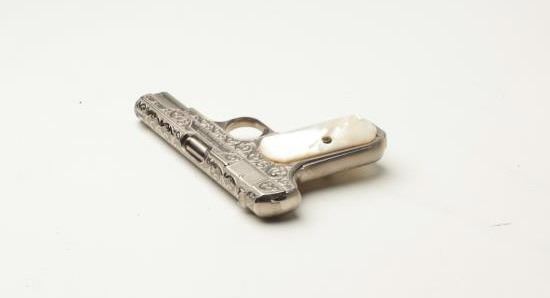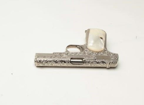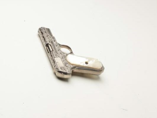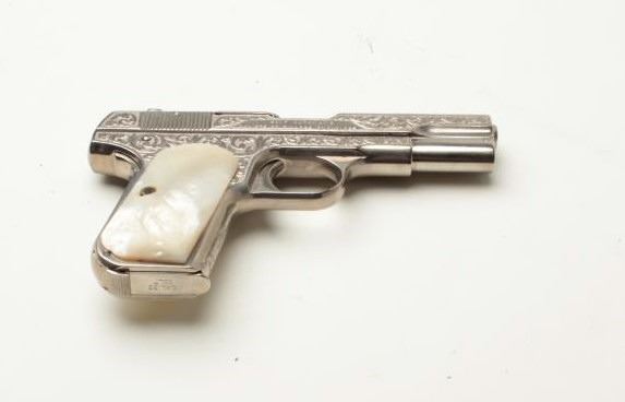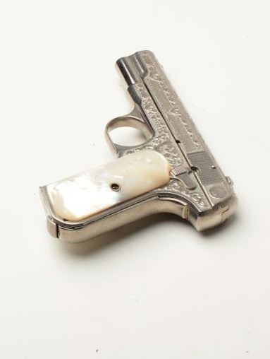 Custom engraved Colt Model 1903 pocket semi-automatic pistol, .32 caliber, 3.75” barrel, re-nickeled finish at time of engraving, thick iridescent pearl grips, S/N 255808, in overall very good to near fine condition as customizedshowing finely accomplished scroll engraving, very good + bore, crisp action, sharp markings and overall fine grips. A beautifully accomplished job of engraving that we were unable to find a visible signature or initials of the artist.(C&R/PPT). Est.: $1,800-$3,600.