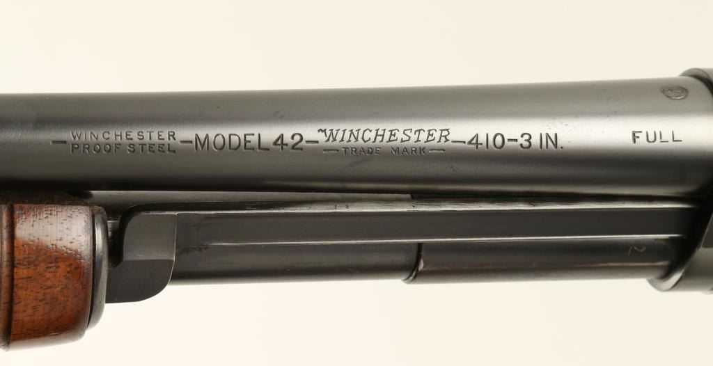 Winchester Model 42 pump action takedown shotgun, .410 gauge, 28” barrel, S/N 33521, blued finish, wood stocks in overall excellent condition displaying the majority of its original blue finish with a fine bore and action; butt stockshows some scattered old mars from carry and storage. (C&R). Est.: $2,000-$4,000.
