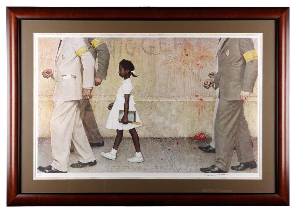 Large framed and matted Norman Rockwell hand signed limited edition (50/200) Collotype entitled “Problem We All Live With”, approximately 35” x 50” overall; with Certificate of Authenticity from Art/Show Galleries, LTD., Chatsworth, CA.;current listings indicate value of $7,500 unframed. Est.: $3,000-$6,000.