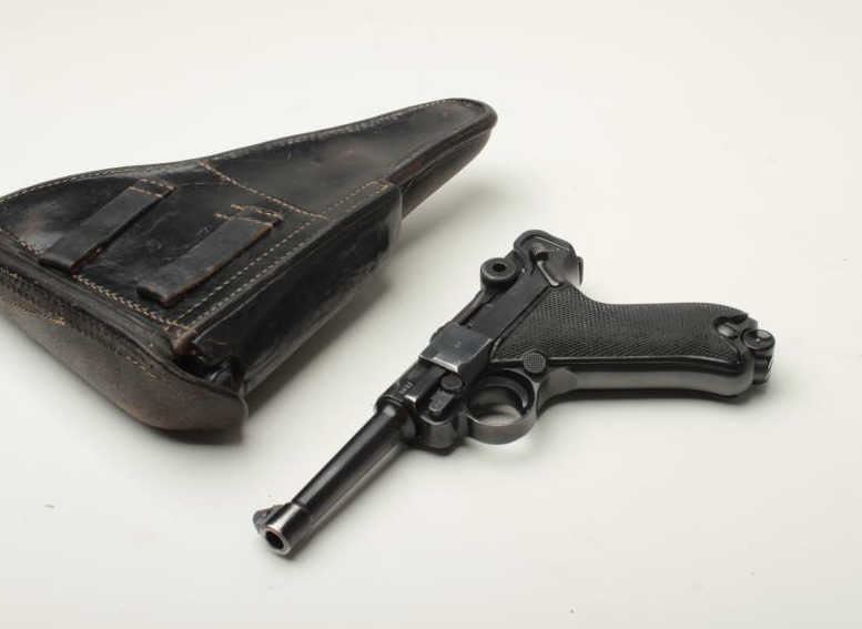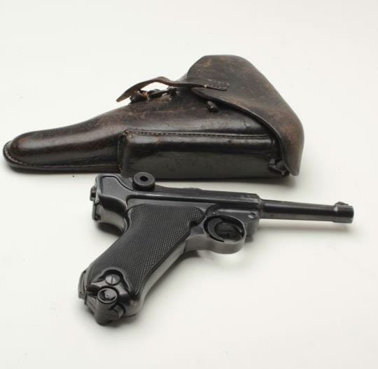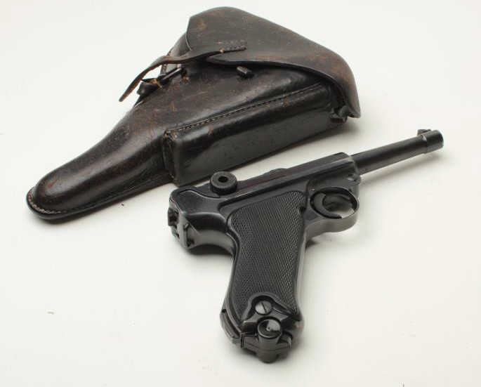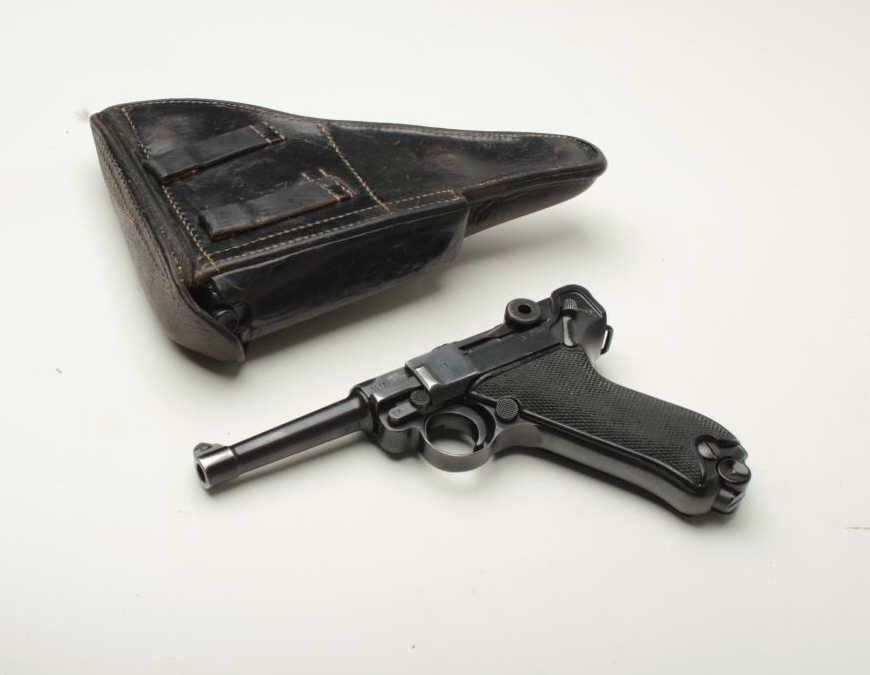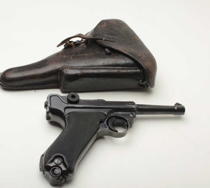 Desirable Mauser (byf) P-08 “Black Widow” semi-automatic pistol, 9mm caliber, 4” barrel, S/N 1017a, all matching visible numbers except two magazines that are un-numbered; black finish, checkered grips, in overall very good to finecondition showing the majority of its finish, some high point wear, several minor old mars to right side of barrel (nothing serious), fine bore, crisp action, sharp markings including a number of visible proofs; top of frame dated “41”; very good + grips; accompanied by a black leather P08 flap holster that houses the extra magazine; holster in overall good condition showing even normal wear from use and carry. (C&R/PPT). Est.: $2,250-$3,250.