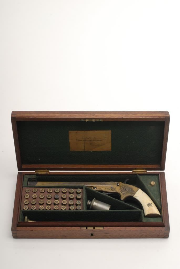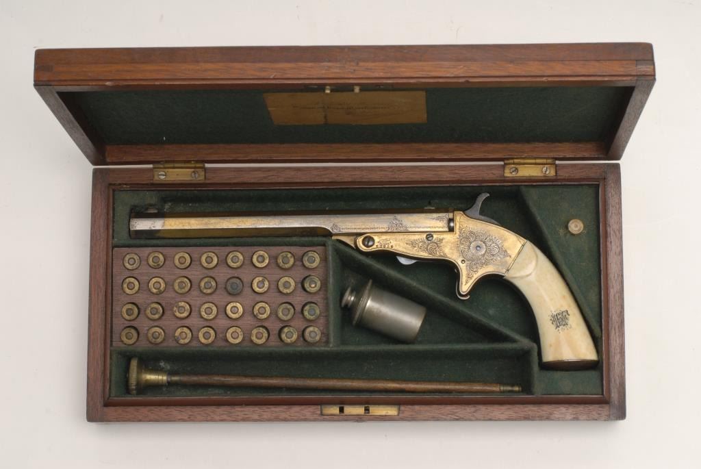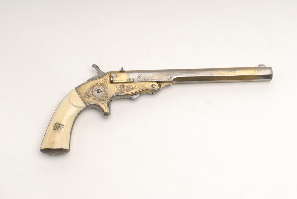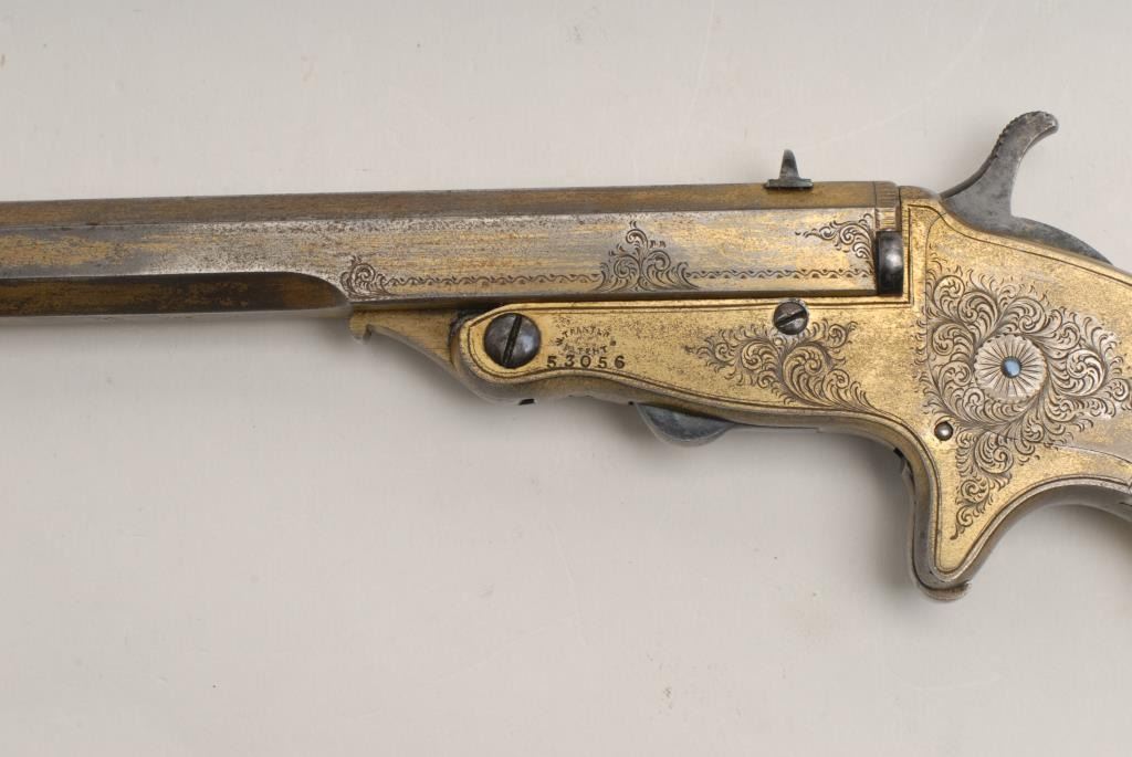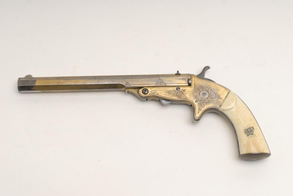 Ornate Tranter patent single shot target pistol marked “Turlock and Hariss, 9 Dawson St., Dublin, Ireland” in .380 caliber with a 8” barrel and nicely scroll engraved with full gold plate and ivory grips incised with monogram of 4 fancyinitials. Contained within its original to the period English style felt lined partition case with label in the lid. The label matches the maker’s inscription and Dawson St. address. The condition is very good plus with 50% rich goldplate drifting and turning to a natural patina. Crisp overall with a bright fire blue on small parts. Est.: $1750-$3500