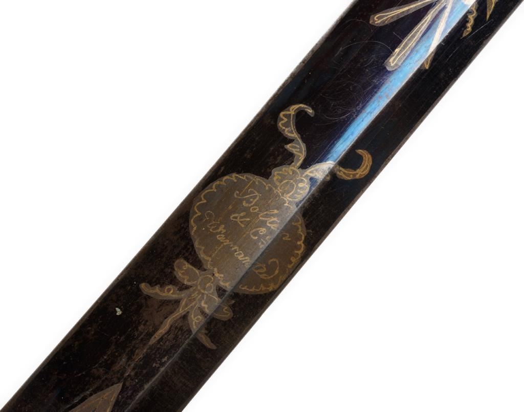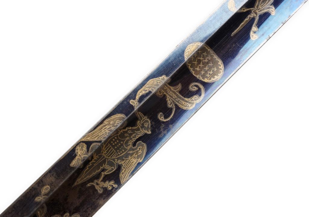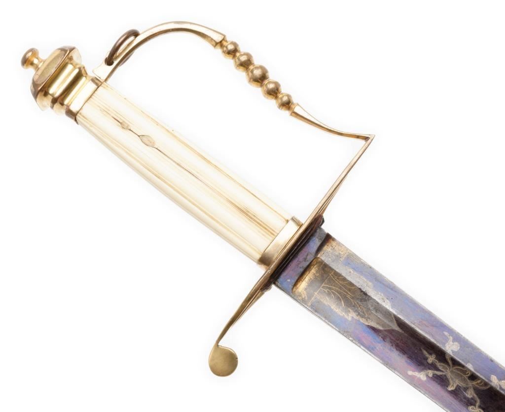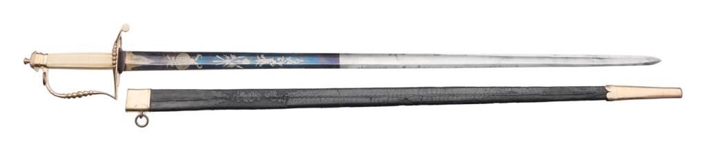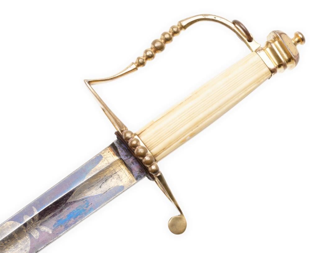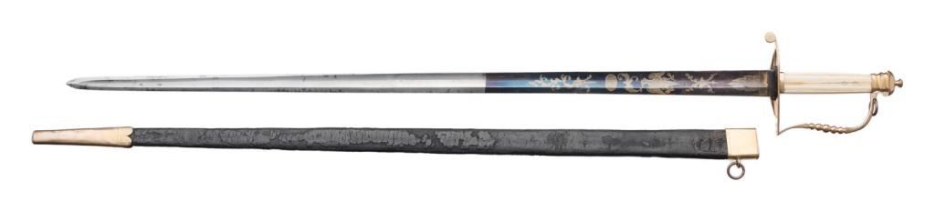 American Federal period pillow hilt sword with leather scabbard. The sword is approximately 37.75” overall with a 32” blade that is decorated with gold patriotic and floral designs on both sides and niter blue finish extendingapproximately 13” toward the point of the blade from the base. The sword’s mounts are gold washed and the grip is of bone. The leather scabbard has a gold washed throat and tip. This beautiful early sword is in overall very good to finecondition showing the majority of its original niter blue finish. It’s design work also maintains the majority of its gold finish. The front half of the blade retains the majority of its original polish with some scattered slight spots oferosion. The scabbard is good overall with considerable flaking of the top layer of leather; seam stitching remains tight. Est.: $2,000-$3,000.