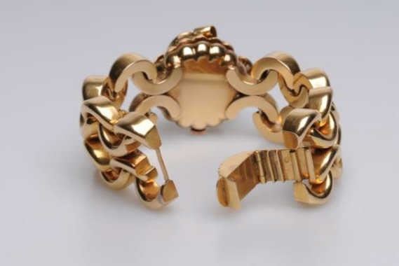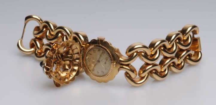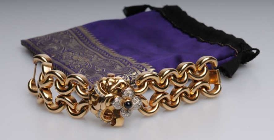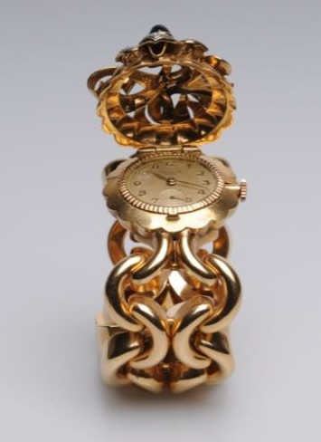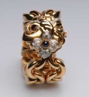 Lot 832 Art Retro Ladies Rose Gold Flip-Top Wrist Watch in 18k Gold set w/Diamonds and Cabachon cut Sapphi