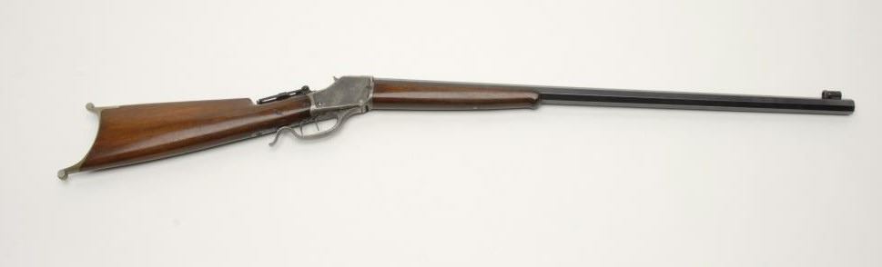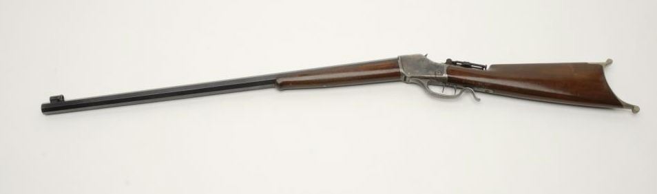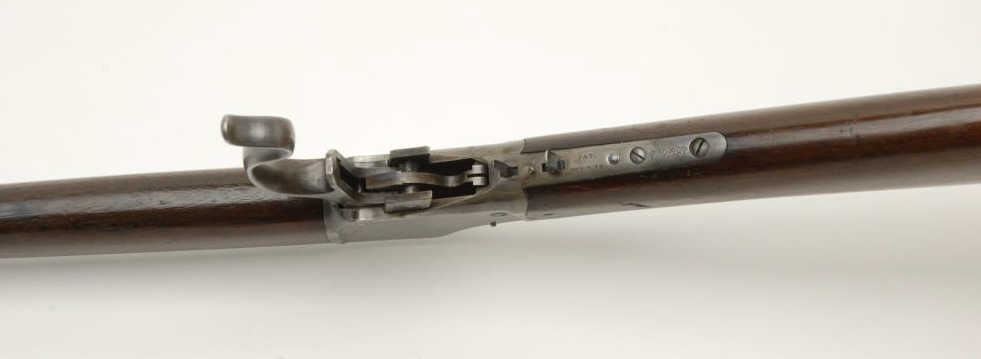 Winchester Model 1885 Hi-Wall single shot rifle, 32-40 cal., serial #79893. The rifle is in very good to nearly fine condition with a #3 octagon barrel. The barrel retains nearly all of its blued finish with a later replacement globe frontsight and period mid-range tang sight. The receiver shows significant toning case color on both sides, as well as the lever. The rifle has double triggers with the factory letter describing the 2nd trigger as a “Scheutzen” set trigger.The smooth wood stocks are in very good overall condition with small mars and loss of finish consistent with storage. The butt stock ends with a nickel plated Swiss butt plate. The bore is very good, the action crisp and markings aresharp. A Winchester factory letter accompanies the rifle confirming the characteristics of the rifle. The letter indicates the rifle was received at the warehouse on June 28, 1899 and consigned the same day. Interestingly, the letter states that the rifle was originally configured as a .22 Long caliber. Est.: $2,500-$3,500. (C+R).