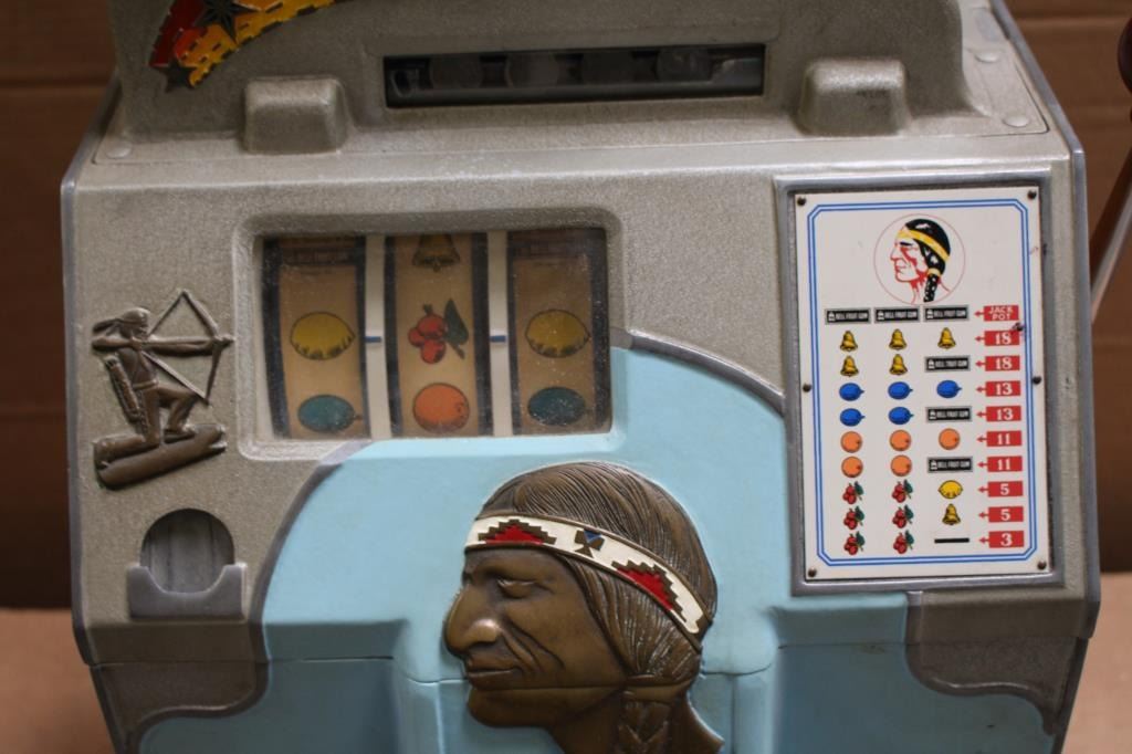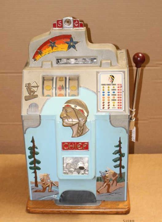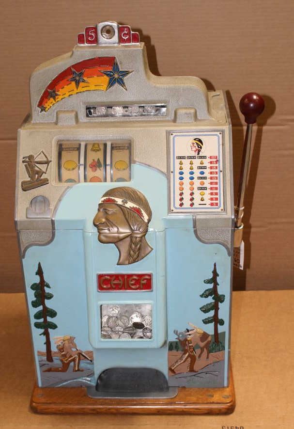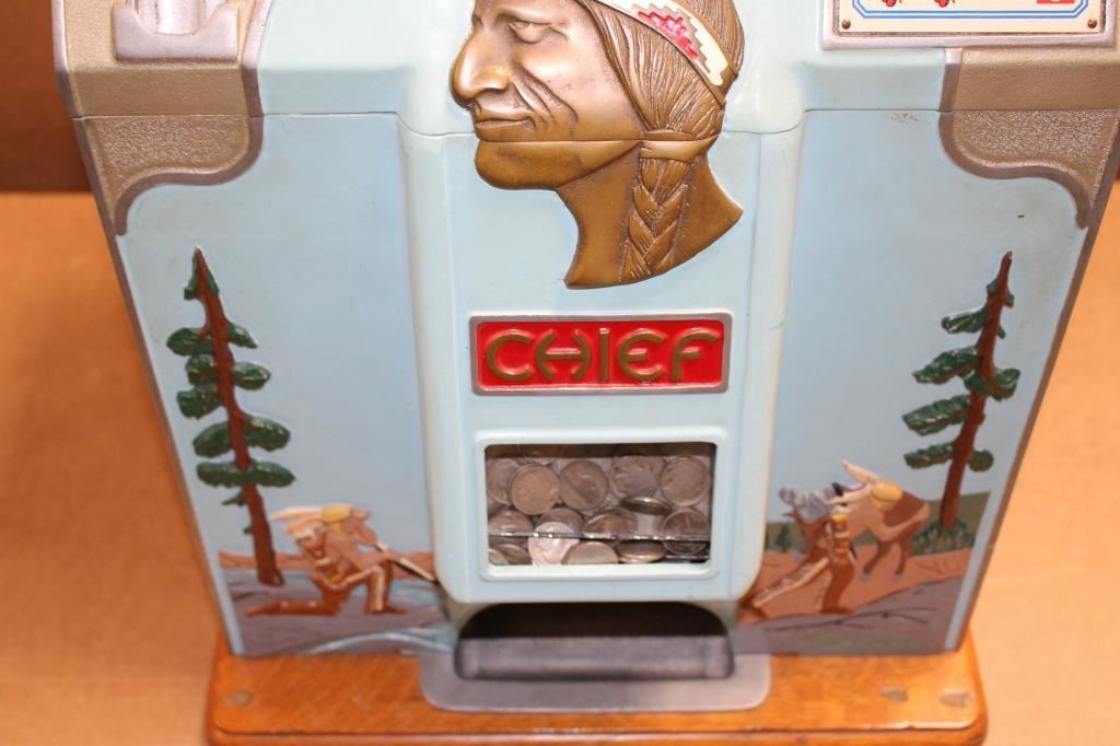 Scot/Jennings “Chief” nickel slot machine; approximately 27” in height, 16” in width and 15” deep; currently not working mechanically but overall very good in appearance. Est.: $2,000-$3,000.
