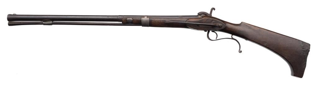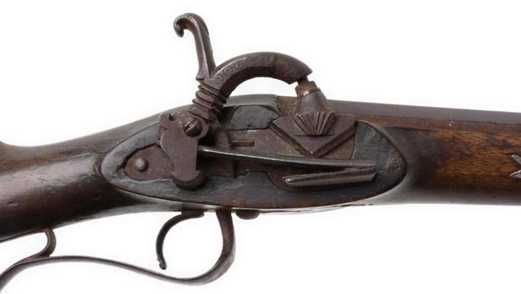 Antique Spanish miguelet carbine, approximately .70 caliber, 25” barrel with gold maker’s marks on top and both sides of barrel at breech, large iron belt hook on left side of half stock with silver barrel band and a pierced silver serpentinlaid into the right side of the fore stock; horn tipped wood ramrod. This great looking early piece is un-cleaned and displays a dark brown patina to metal surfaces; working action and worn stock from years of carry and storage; very oldrepair to butt stock at rear; easily could have come to the New World as it was previously in an old Texas estate. Est.: $1,500-$3,000.