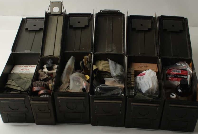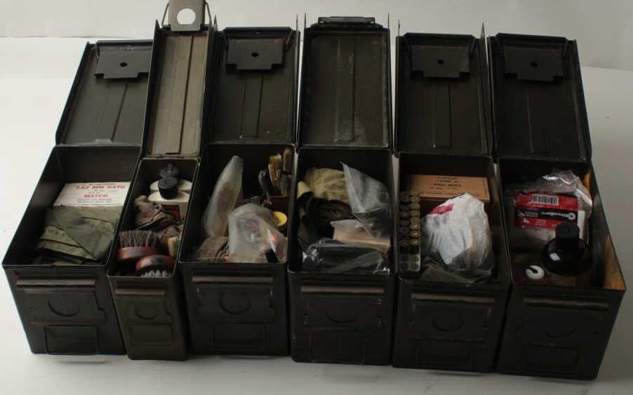 Six military metal ammo cans; 3 filled with gun cleaning supplies; 3 filled with ammo consisting mostly of .45 caliber pistol brass, .22LR ammo, .30-06 ammo, .45LC ammo, .30 carbine ammo, .303 British ammo and brass. Est.: $75-$150.