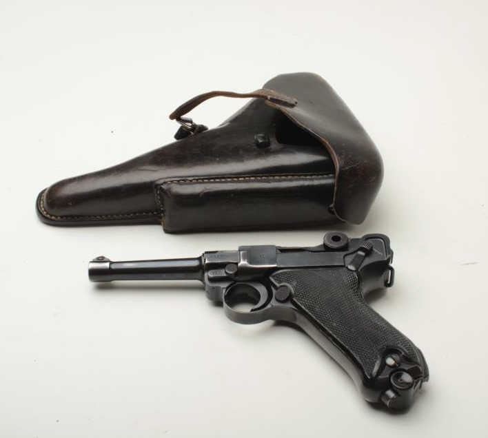 Desirable Mauser (byf) P-08 “Black Widow” semi-automatic pistol, 9mm caliber, 4” barrel, S/N 2472l, all matching visible numbers except two magazines that are un-numbered (one marked “MADE IN HOLLAND”); black finish, checkered grips, inoverall very good to fine condition showing the majority of its finish, some high point wear, fine bore, crisp action, sharp markings including a number of visible proofs; top of frame is dated “42”; fine grips; accompanied by a black leatherflap holster that houses the extra magazine; holster in overall very good condition with normal wear from carry and storage. (C&R/PPT). Est.: $2,750-$3,750.