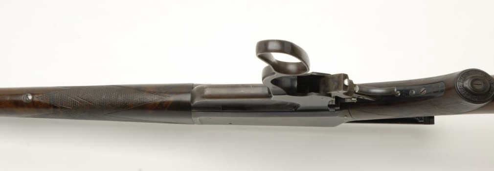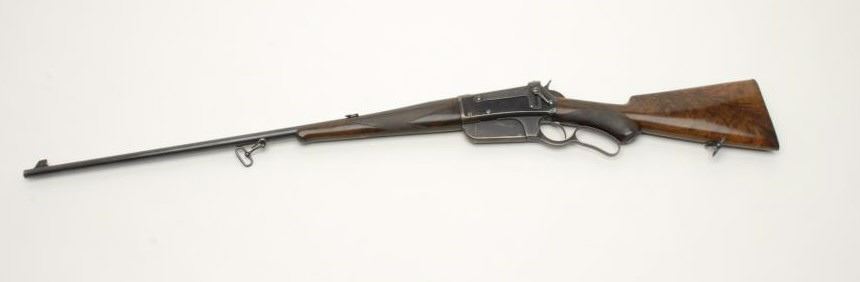 Winchester Model 1895 Deluxe flat side lever action rifle, .30 U.S. cal., serial #1771. The rifle is in fine overall condition with a 28” round barrel. The barrel retains nearly all of its thinning blue finish with muzzle wear noted.The barrel features a Lyman front, folding, flat top sporting rear and receiver sights. The receiver retains the majority of its muted blue finish considerable case coloring observed on the hammer and trigger assembly. The rifle has hadsafari style sling swivels added at some point. The finely checkered, pistol grip stock features beautifully figured wood with stunning feather crotch in the butt stock. The butt stock has a Winchester marked hard rubber cap on the pistolgrip and ends with a smooth, metal shotgun butt plate. The bore is very good, the action crisp and markings sharp on this deluxe Model 1895. A Winchester factory letter accompanies the rifle noting it was received at the factory on May 15,1897 and shipped out the same day. The letter further confirms the host of special order features noted on this rifle. The most significant being the factory pistol grip stock of which it is believed only 286 were produced. A