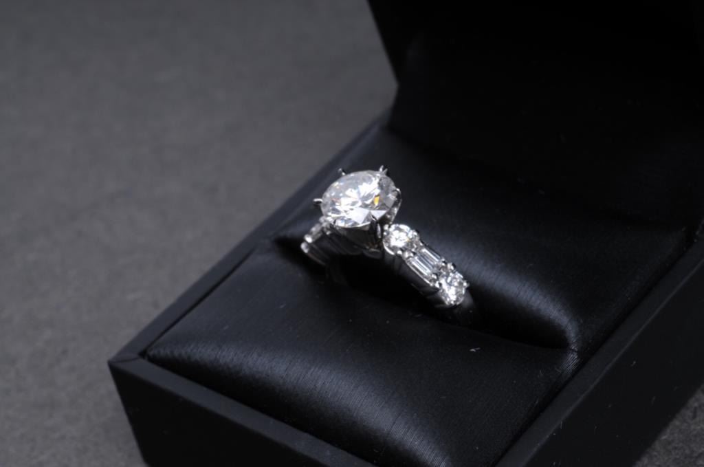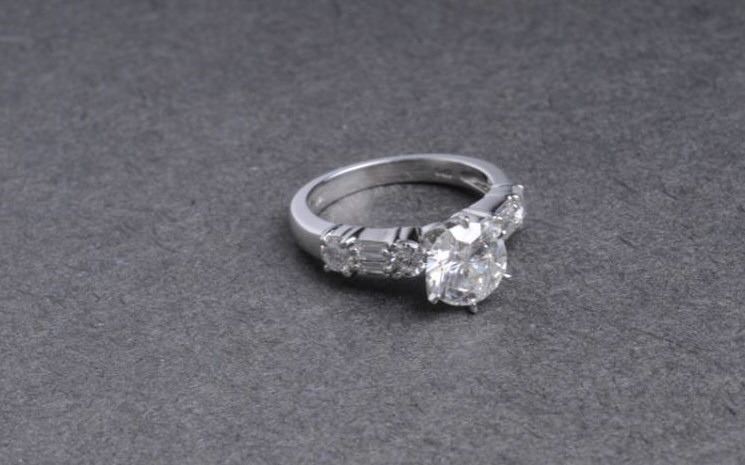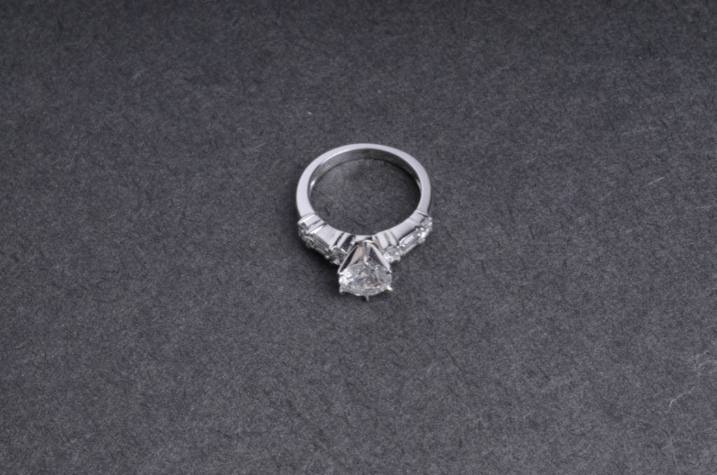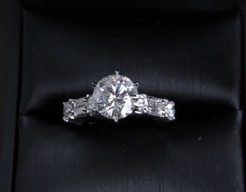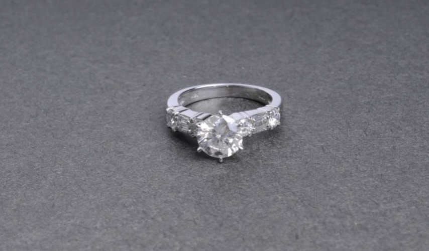 One ladies diamond engagement ring in 14k white gold.center weighing 1.55ct color H clarity I-1 plus 4 rounds and 4 baguettes weighing approx 0.50ct Est:$6,000-7,000