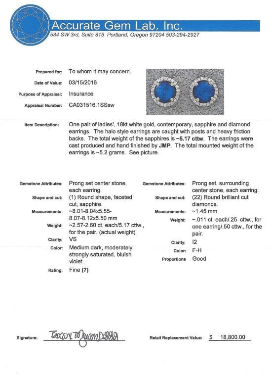 Exceptional ladies earrings set with two round Fine Ceylon color Sapphires weighing 5.17 carats and encircled with 44 round diamonds weighing approx. 0.50 carats of H-I colors and SI clarity set in 18 karat white gold custom setting. Retail $18,800.00 Estimates $8,000-$12,000 Please see FULL Appraisal.