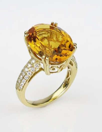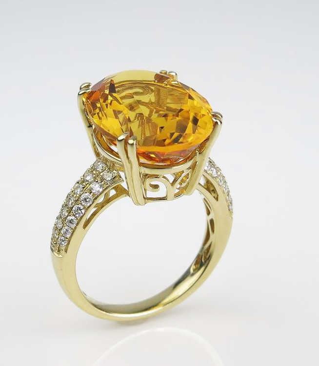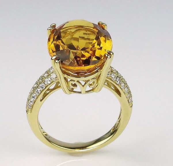 Amazing ladies ring set with a large fine Citrine weighing approx. 15.00 carats of VS clarity accented with 42 pave set diamonds weighing approx. 0.50 carats of G-H colors and VS clarity set in 14 karat yellow gold custom setting.Retail $3,000-$4,000 Estimates $1,500-$2,000