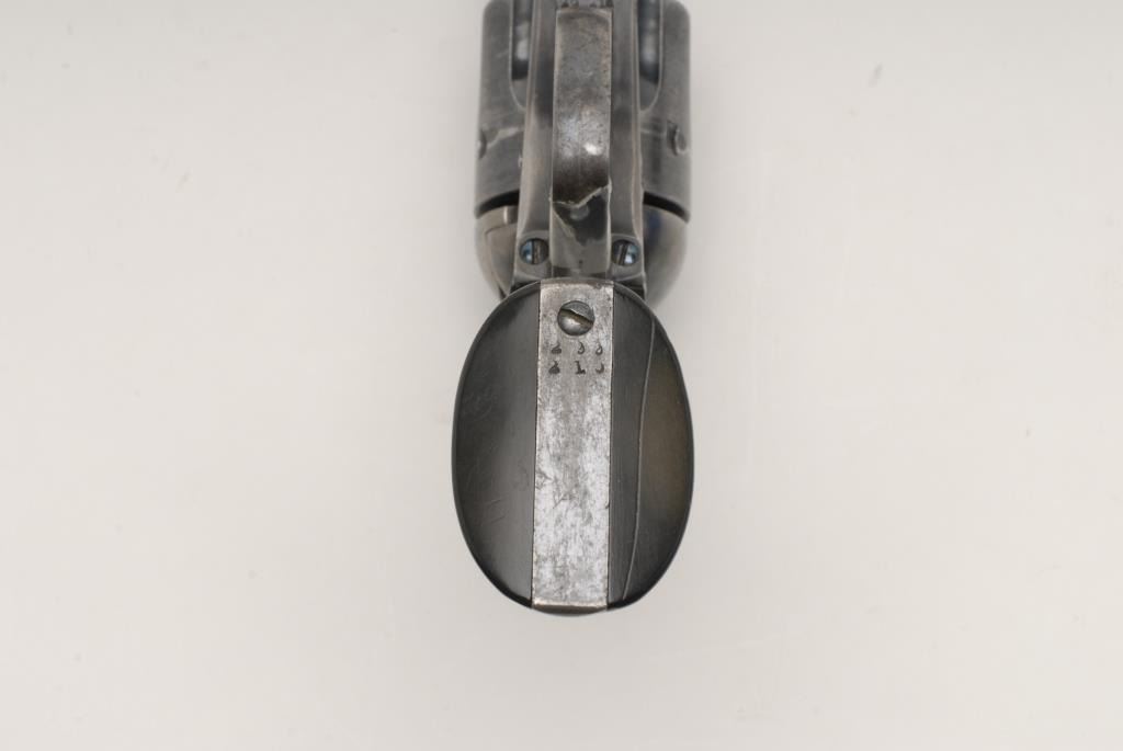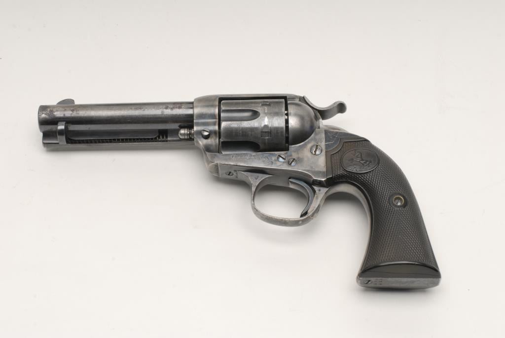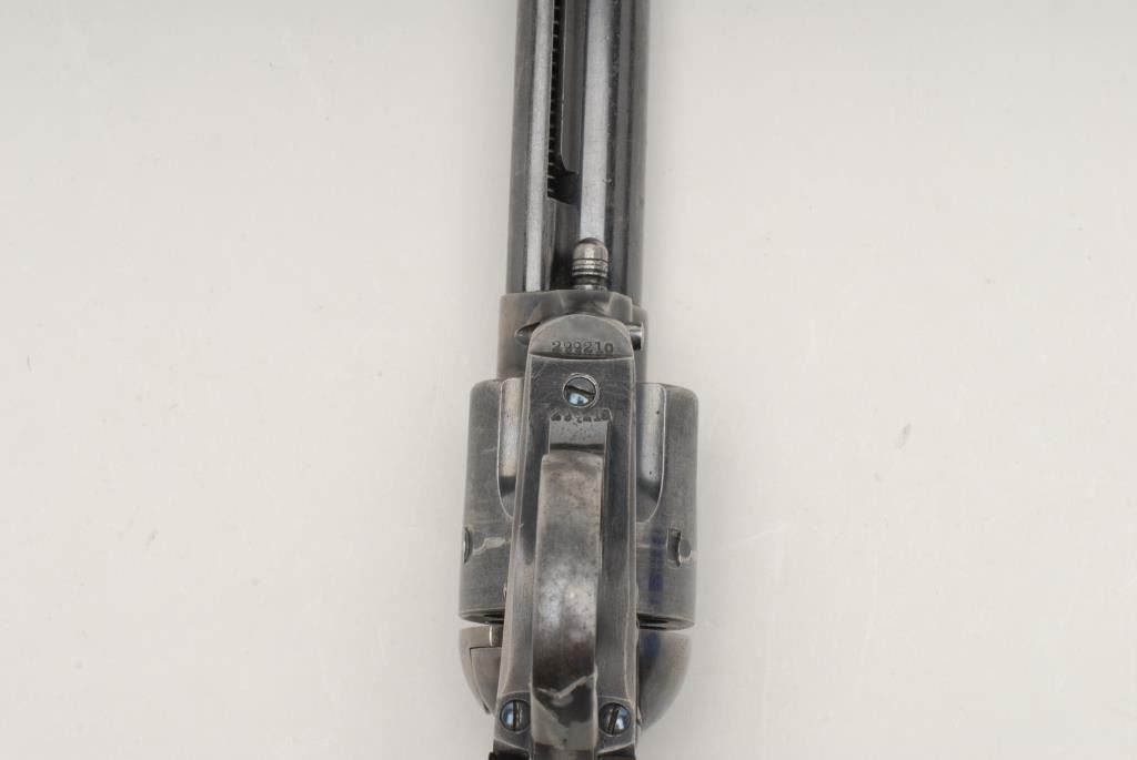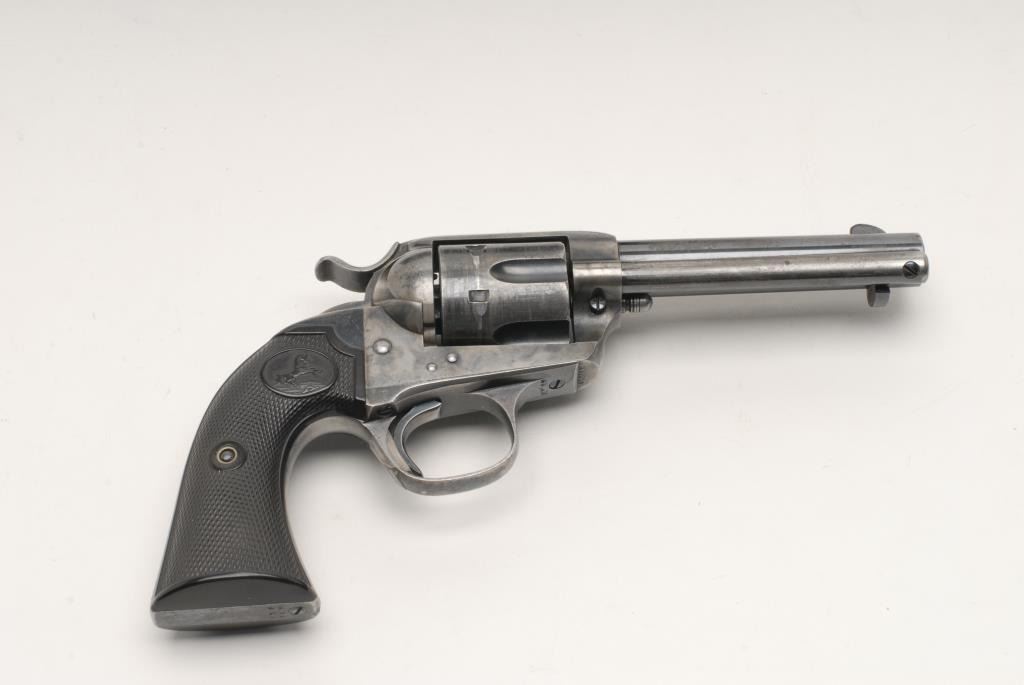 Colt Bisley Single Action Revolver, .32 W.C.F. caliber, 4 ¾” barrel, blue and case hardened, checkered hard rubber grips, S/N 299210. This revolver remains in good to very good condition showing approximately 40%-50% blue remaining along with mottled case colors on the frame. There are scattered areas of pitting and erosion most of which is toward the muzzle on the left side. Some of the screws have been buggered but still retained some of their niter blue finish. Thegrips remain in very good condition with some scratches from use. The markings are sharp, the action is crisp and the bore is very good. Accompanied by a factory letter confirming all features with stocks “Not Listed”; shipped toHibbard, Spencer, Bartlett & Company; September 11, 1907; 10 guns in shipment. (C&R/PPT) Est.: $1400-$2800