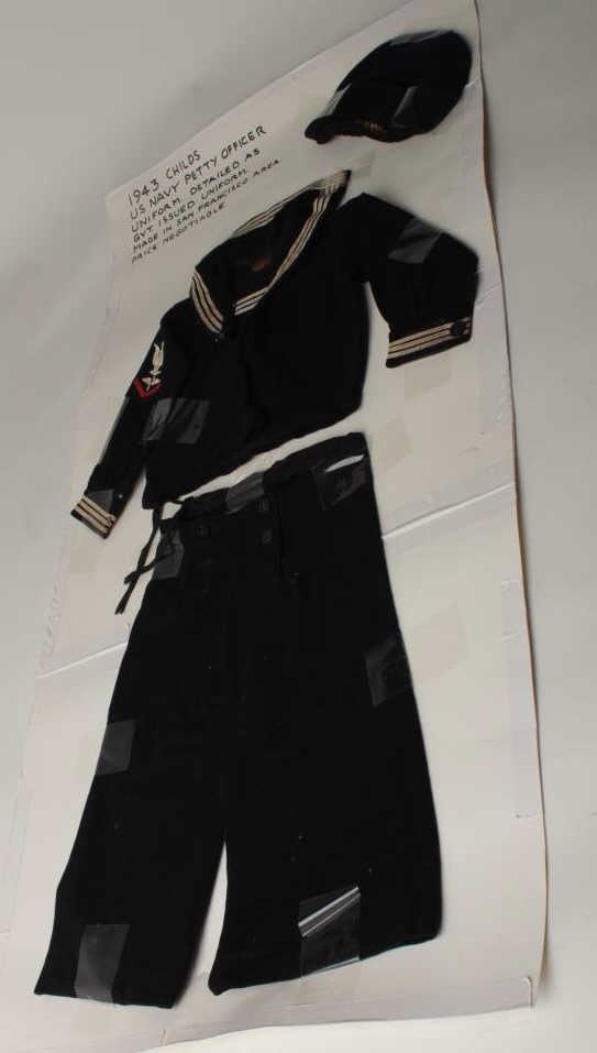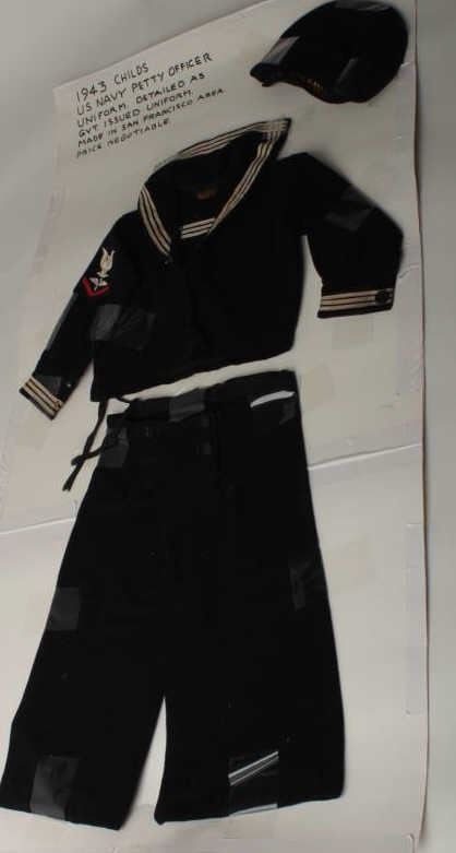 1940’s to 1960’s custom tailored sailors suit for child about 2-4 years old; authentic patches and construction; often made near Navy Bases for sons to greet their fathers home comings and dependents day cruises. Darling! Est.: $200-$400.