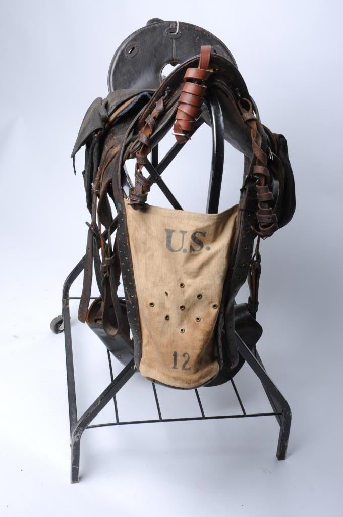 Model 1874 McClellan saddle, fully rigged with skirts; accompanied with a set of pommel bags and an original grain bag; carbine socket; two original coat straps and one reproduction coat strap; stitching is mostly sound but loose at therear. Est.: $1,000-$2,000.