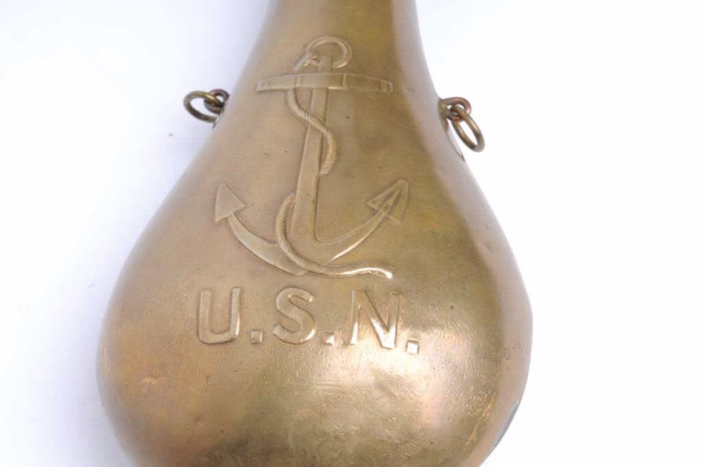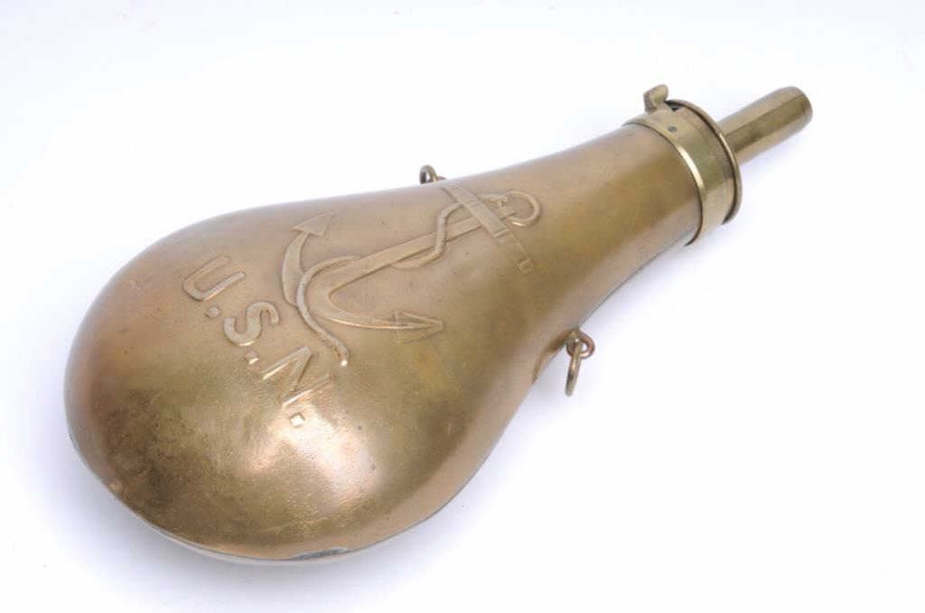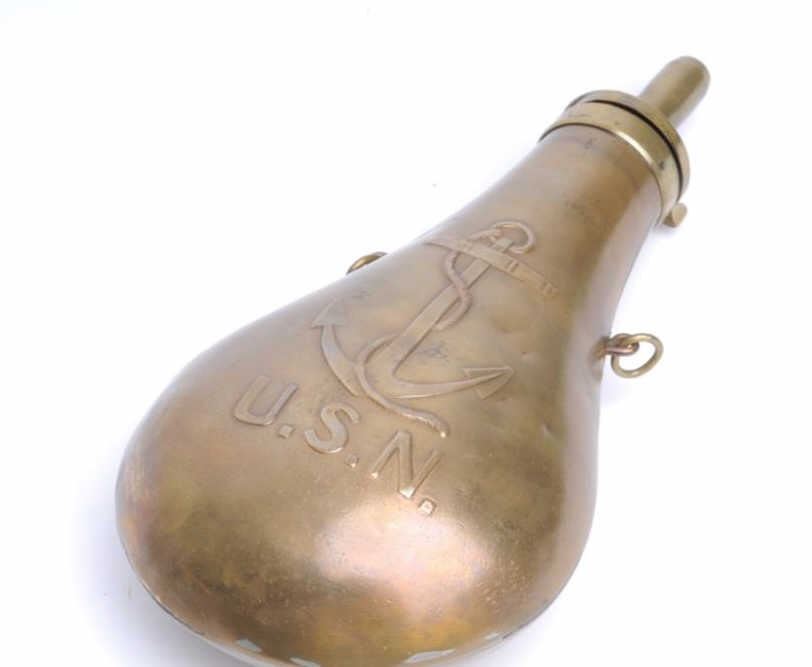 U.S. N. fouled anchor large flask by Stimpson, dated 1845 and marked with inspector’s initials “O.H.P.”; approximately 9.25” in length and in overall good condition. Est.: $600-$800.