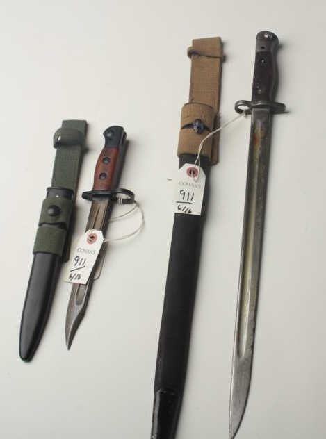 Lot of 2 British military bayonets with scabbards and frogs; first is a No. 5 Jungle carbine bayonet by Wilkinson in minty condition; the other is also by Wilkinson, a Model 1907, in overall good condition. Est.: $200-$400.