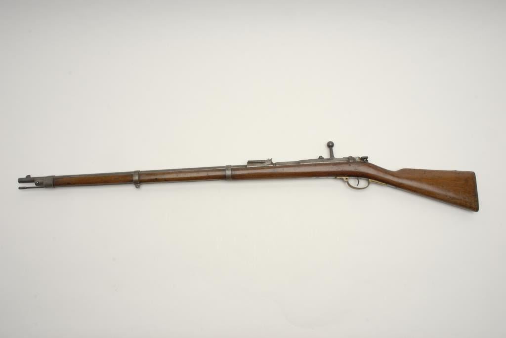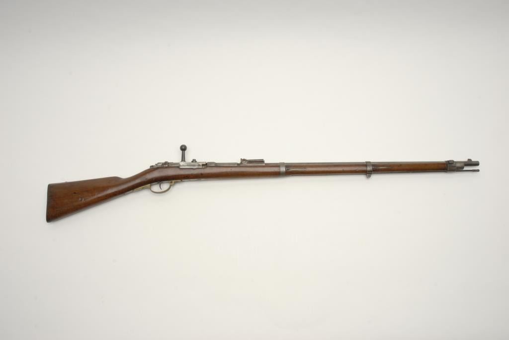 German Model 71 bolt action rifle in 11mm marked “Osterwaffeb. S” and “P.W.” proofs, S/N 3606P. Matching visible serial numbers including the bolt. Inspection marks visible on the belly of the stock and retains the ramrod. In good overallcondition with many storage dings in the wood and great bore. (Antique) Est.: $300-$600