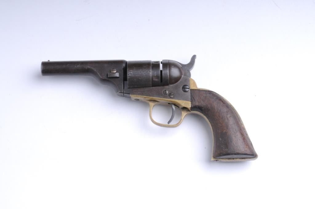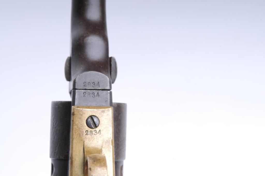 Colt .38 rimfire with 3 ½” barrel showing 1871-72 patent dates and serial numbered in its own range (2834) for sale as a cartridge arm using some left over percussion parts. There are traces of blue and case hardening within a brown patina alongwith some minor pitting and storage, nicks, dings, and mars mostly on the cylinder. The grips are under sized and replacements from another Colt or sanded. The markings are good and all matching. (Antique) Est.: $350-$700