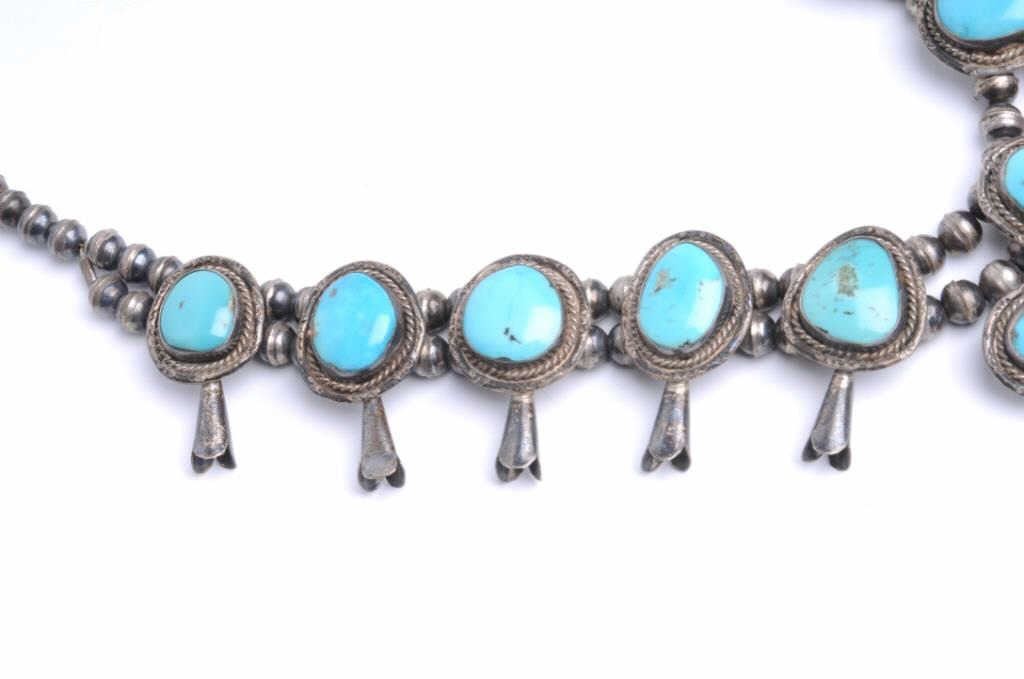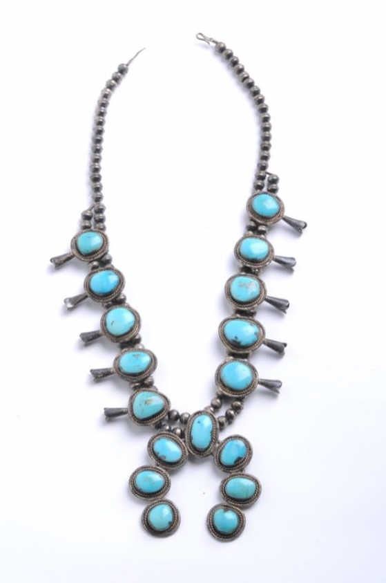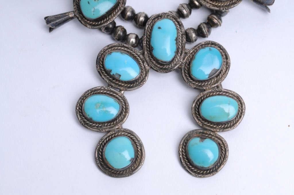 Lot 924 Beautiful large older turquoise and silver squash blossom necklace with near gem quality stones; g